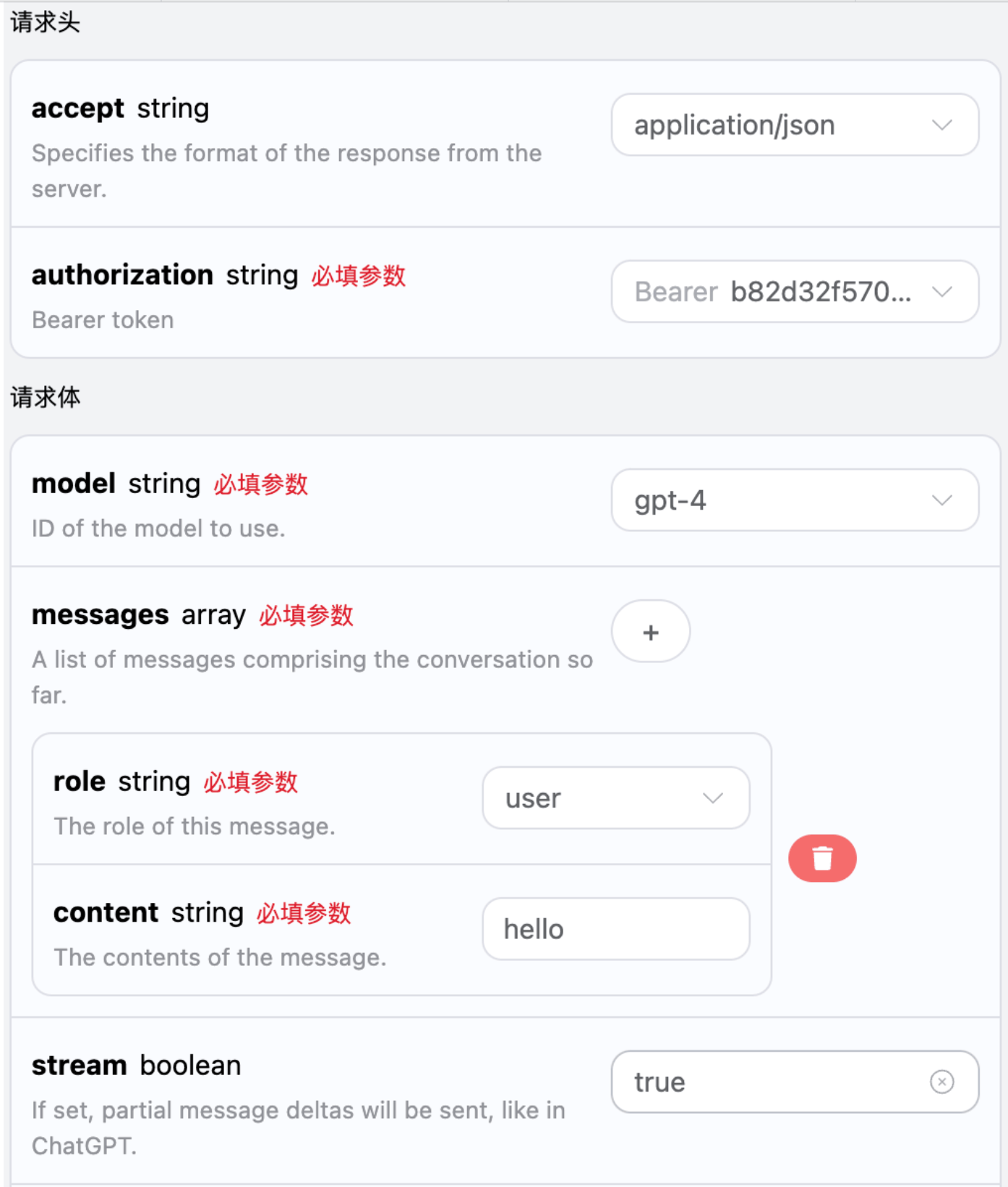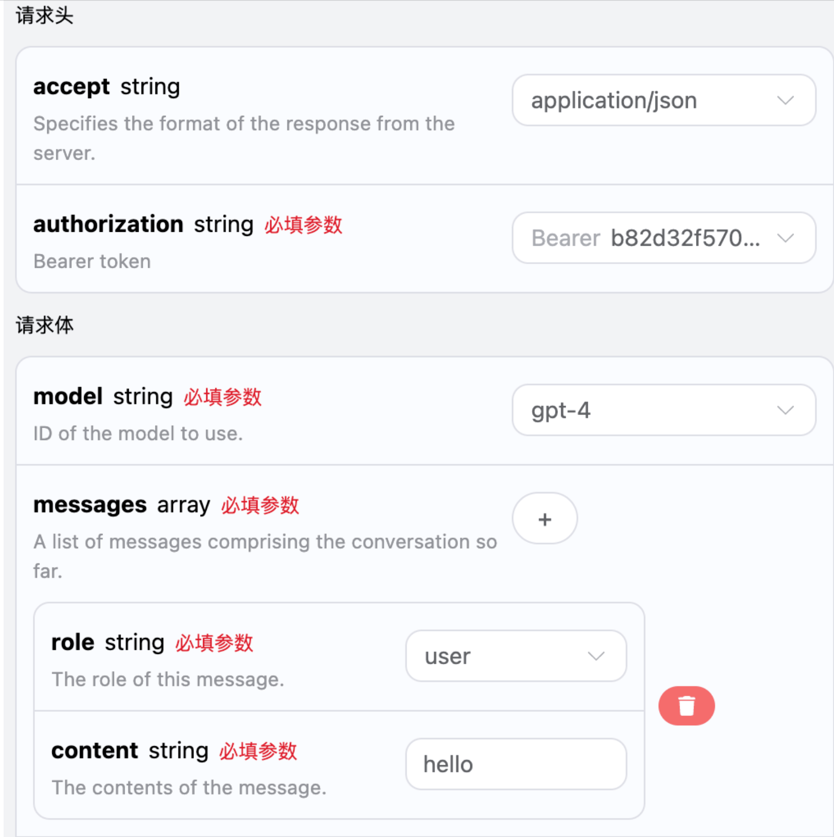When using this interface for the first time, we need to fill in at least three pieces of information: one is authorization, which can be selected directly from the dropdown list. The other parameter is model, which is the category of the OpenAI ChatGPT model we choose to use. Here we mainly have 20 types of models; details can be found in the models we provide. The last parameter is messages, which is an array of our input questions. It is an array that allows multiple questions to be uploaded simultaneously, with each question containing role and content. The role indicates the role of the questioner, and we provide three identities: user, assistant, and system. The other content is the specific content of our question.