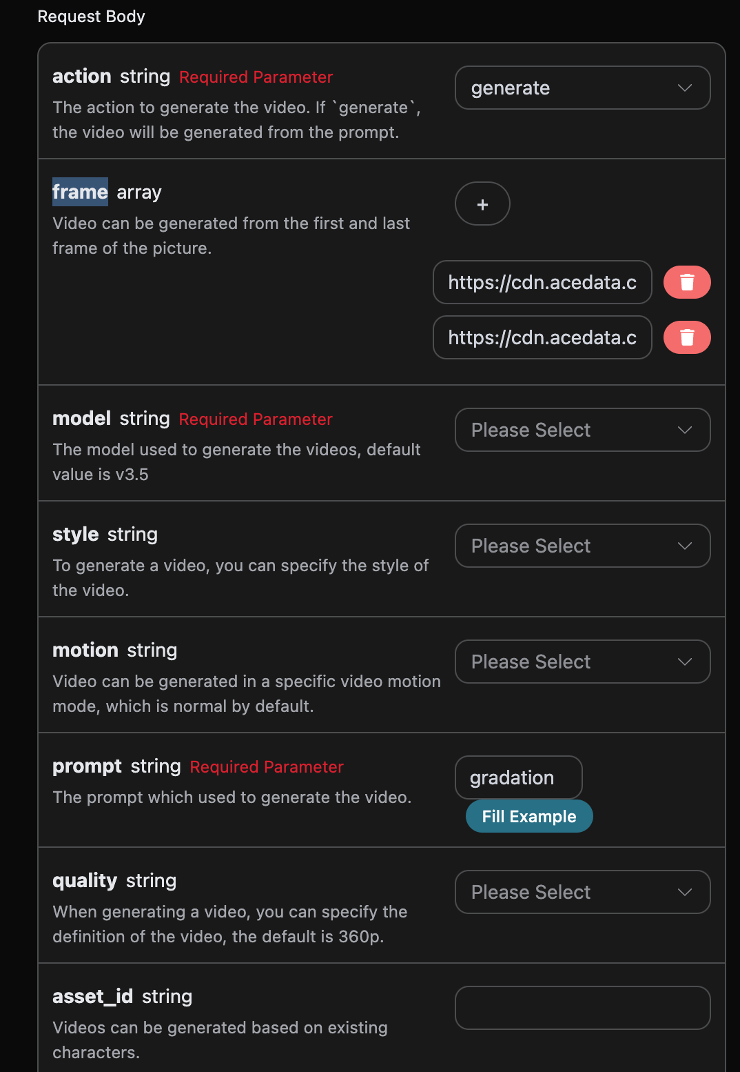 - frame: An array of links to the first and last frame images for this video generation.