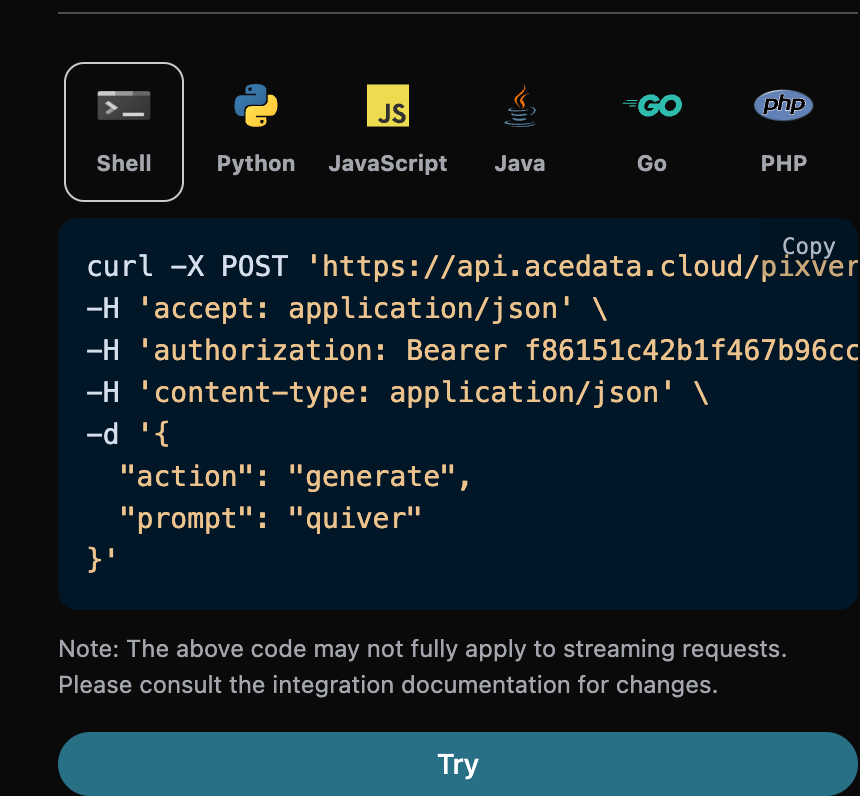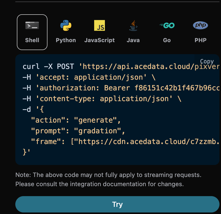 You can click the "Try" button to directly test the API, and after waiting for 1-2 minutes, the result is as follows: