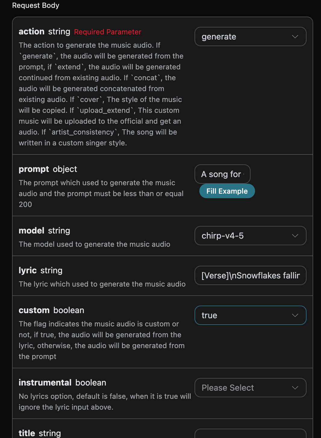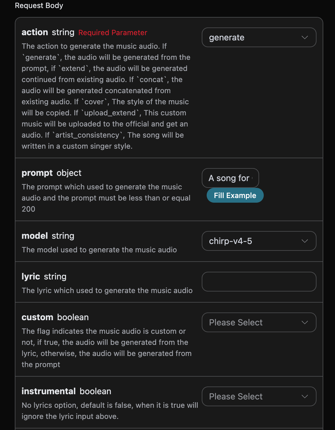 action: the behavior of this music generation task, default isgenerate, mainly includes:extend,upload_extend,cover,upload_cover,replace_section,replace_section,concat,stems,all_stems.prompt: the prompt for Suno's official inspiration mode.model: the model for this music generation task, default ischirp-v3-5, mainly includes:chirp-v3,chirp-v4,chirp-v3-5,chirp-v4-5,chirp-v4-5-plus.lyric: the lyrics content for Suno's official custom mode.custom: whether to use the custom mode, default is:false.instrumental: the pure music option for Suno's official inspiration mode.title: the music title for Suno's official custom mode.style: the music style for Suno's official custom mode.style_negative: the excluded style for Suno's official custom mode.audio_id: the ID of the reference music.persona_id: the artist's song ID.weirdness: advanced parameter for weirdness.continue_at: the time in seconds to continue the existing audio. For example, 213.5 means continue to 3 minutes and 33.5 seconds.style_influence: advanced parameter for style influence.replace_section_end: the end time of the replacement section.replace_section_start: the start time of the replacement section.callback_url: the URL to receive the callback result.