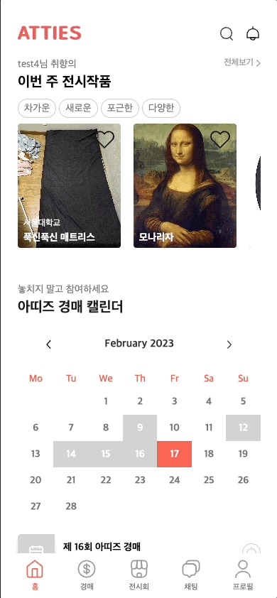 | 픽 리스트, 찜 리스트 | 홈 화면 | 전시회 화면 |
