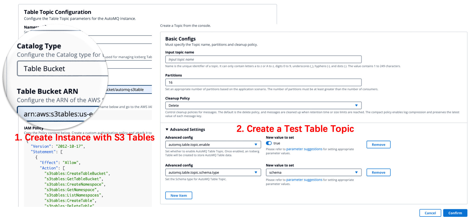 After the instance is ready, go to the Topics section in AutoMQ BYOC, create a test topic, and activate the Table Topic feature for it.