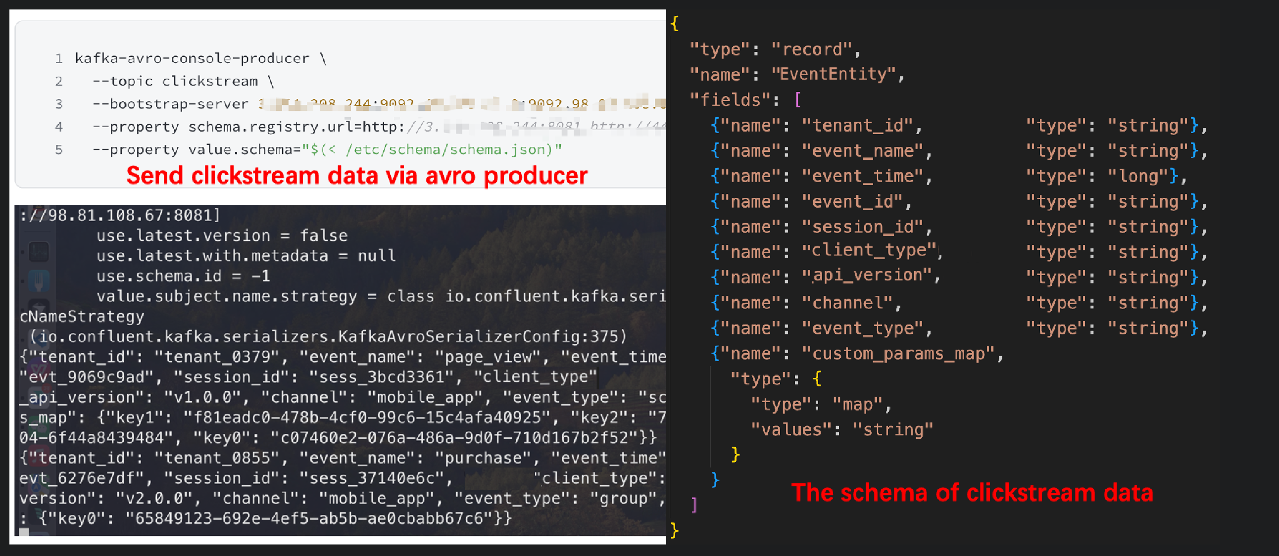 Get the endpoints for your AutoMQ instance and Schema Registry from the AutoMQ BYOC Console. Utilize Kafka clients to link to your AutoMQ instance with these endpoints, and dispatch Clickstream data to the Table Topic you established in the prior step.