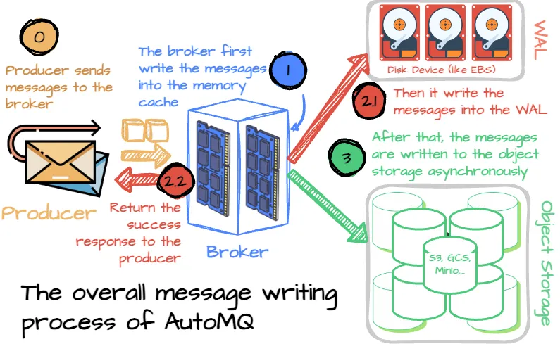 With AutoMQ, things got very different. Let’s take a look closer at the message-writing process: