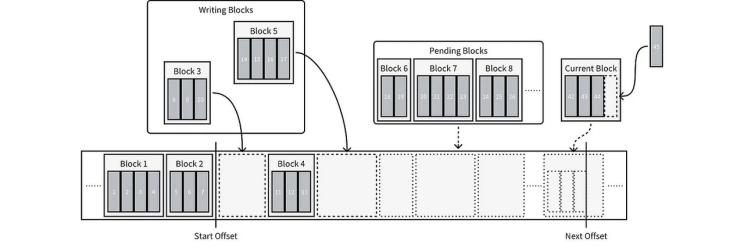 currentBlock : The latest arrived log from the cache. Records that need to be written are placed in this block. New records are also allocated logical offsets here. When the currentBlock is full, all blocks are placed in pending blocks. At this time, the system will create a new current block.