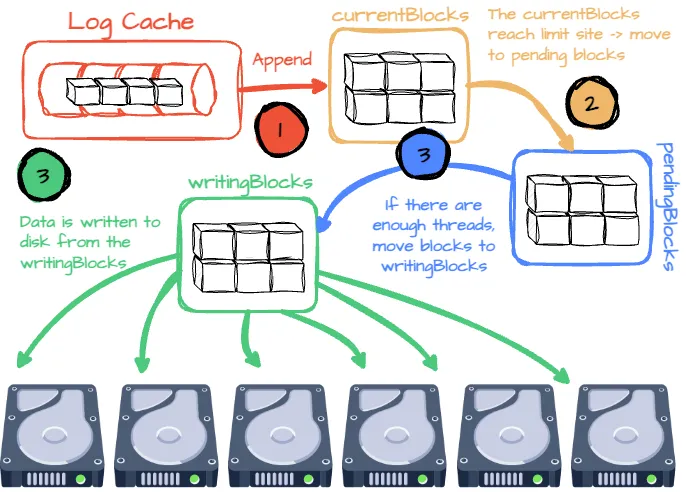 pendingBlocks : Blocks waiting to be written; new blocks go here when the IO thread pool is complete, moving to writingBlocks when space is available.