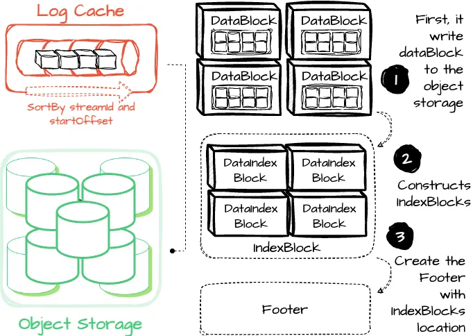 - The message in the log cache is asynchronously written to the object storage after landing in the WAL.