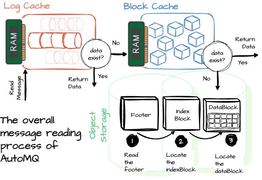 Reading operations in AutoMQ follow the following paths: If the request requires recently written data, it reads from the log cache. It’s important to note that only messages already written to the WAL are available to fulfill the request. If the data isn’t in the log cache, the operation checks the block cache.