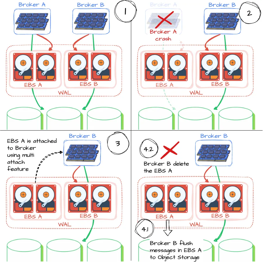 So, what if one of the brokers, says broker A, crashed? What happened with that broker’s EBS storage device? How about the EBS data that had not been written to object storage?