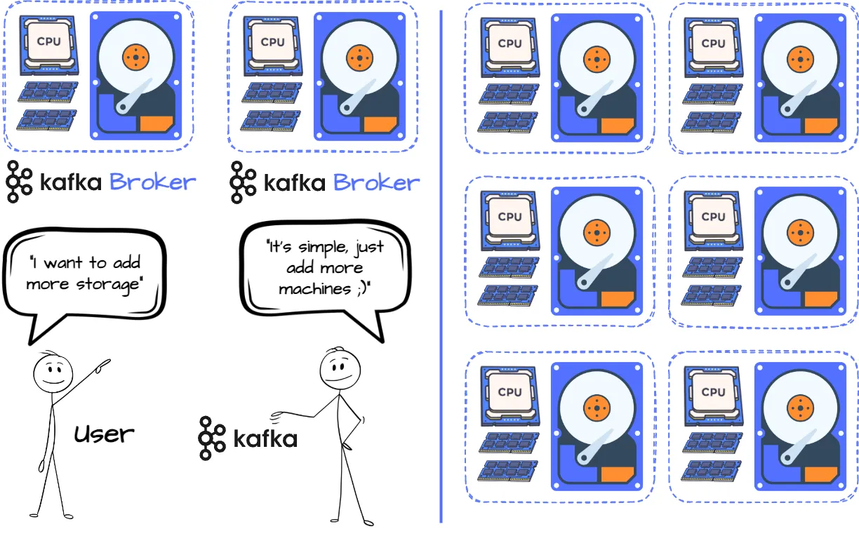 This design tightly couples computing and storage, meaning adding more machines is the only way to scale storage. If you need more disk space, you must add more CPU and RAM, which can lead to wasted resources.