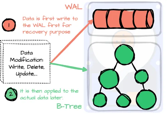 The EBS storage acts as the Write Ahead Log (WAL), an append-only disk structure for crash and transaction recovery. Databases that use B-Trees for storage management usually include this data structure for recovery; every modification must go through the WAL before being applied to the data. When the machine returns from a crash, it can read the WAL to recover to the previous state.