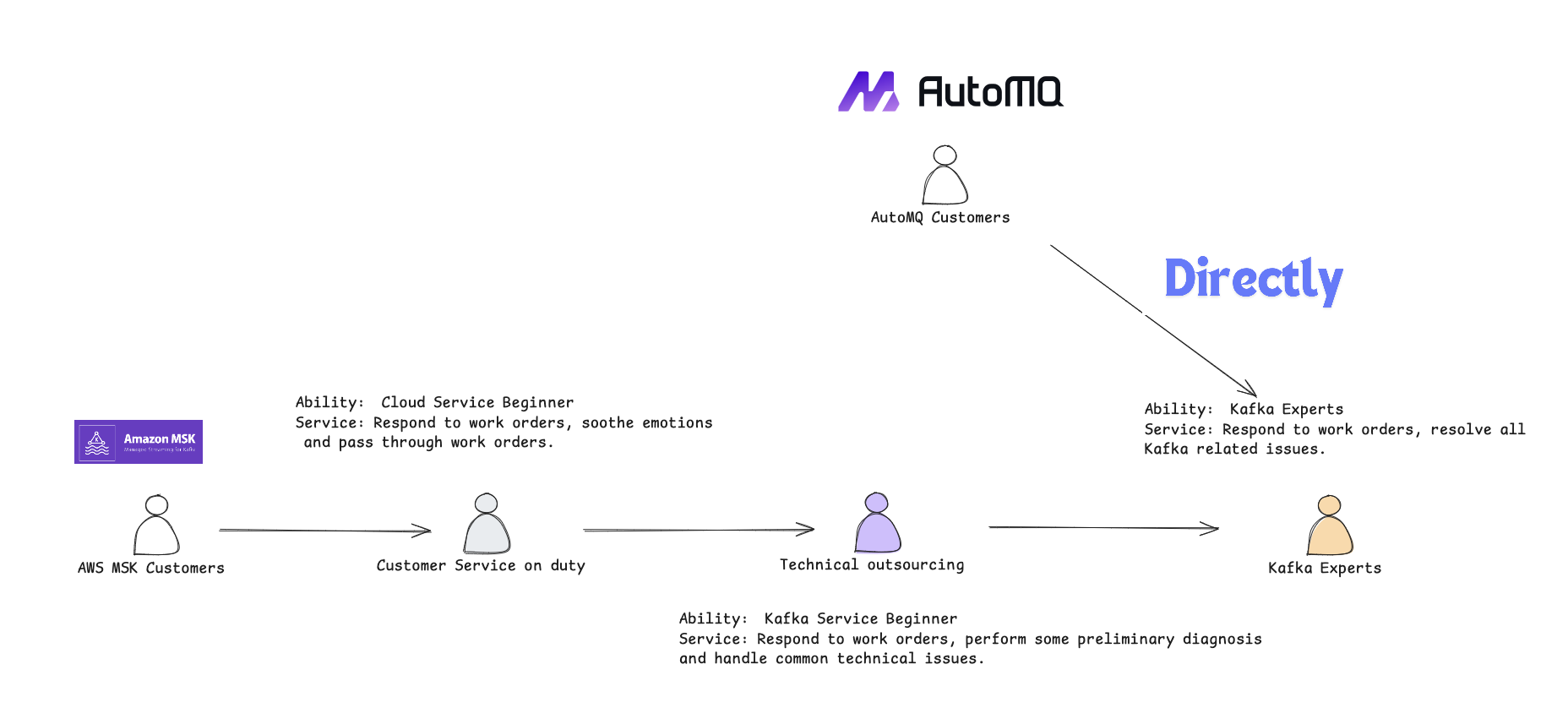• AutoMQ Business Edition provides free direct support from technical experts : Most major cloud providers do not offer direct interaction with their core product development teams to customers as this significantly increases their costs. If you use AWS MSK, your support requests will pass through multiple handlers before reaching the core development team. AutoMQ Business Edition offers more user-friendly commercial support, allowing direct consultation, troubleshooting, and diagnosis with the core development team, and rapid intervention in emergencies. Shorter and more professional support means your queries will receive better quality responses, reducing the time your staff spends on problem-solving and significantly lowering the overall TCO. Notably, this commercial technical support from AutoMQ is included in your business subscription at no extra cost.