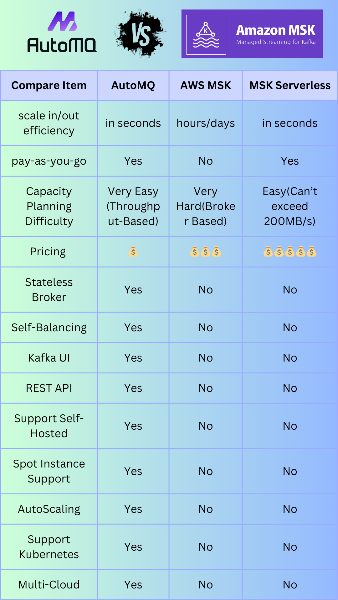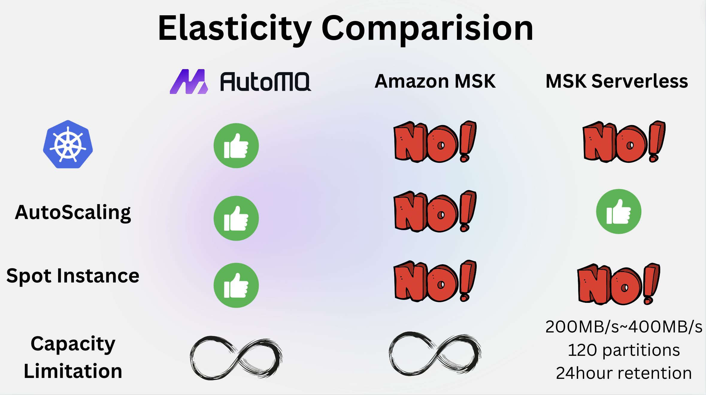 • AutoMQ : AutoMQ fundamentally reimagines Apache Kafka's storage layer for cloud-native environments. By embracing a cloud-first approach, it offloads persistence to mature cloud storage services like EBS and S3. The primary distinction from Apache Kafka is that the entire computation layer is stateless. This statelessness makes the architecture highly elastic. Within this elastic architecture, AutoMQ can leverage cloud technologies like Spot instances and auto-scaling to significantly reduce costs while also operating more efficiently on Kubernetes. It is the only product among the three that truly achieves cloud elasticity, eliminating all the costs and operational complexities associated with Kafka's lack of elasticity.