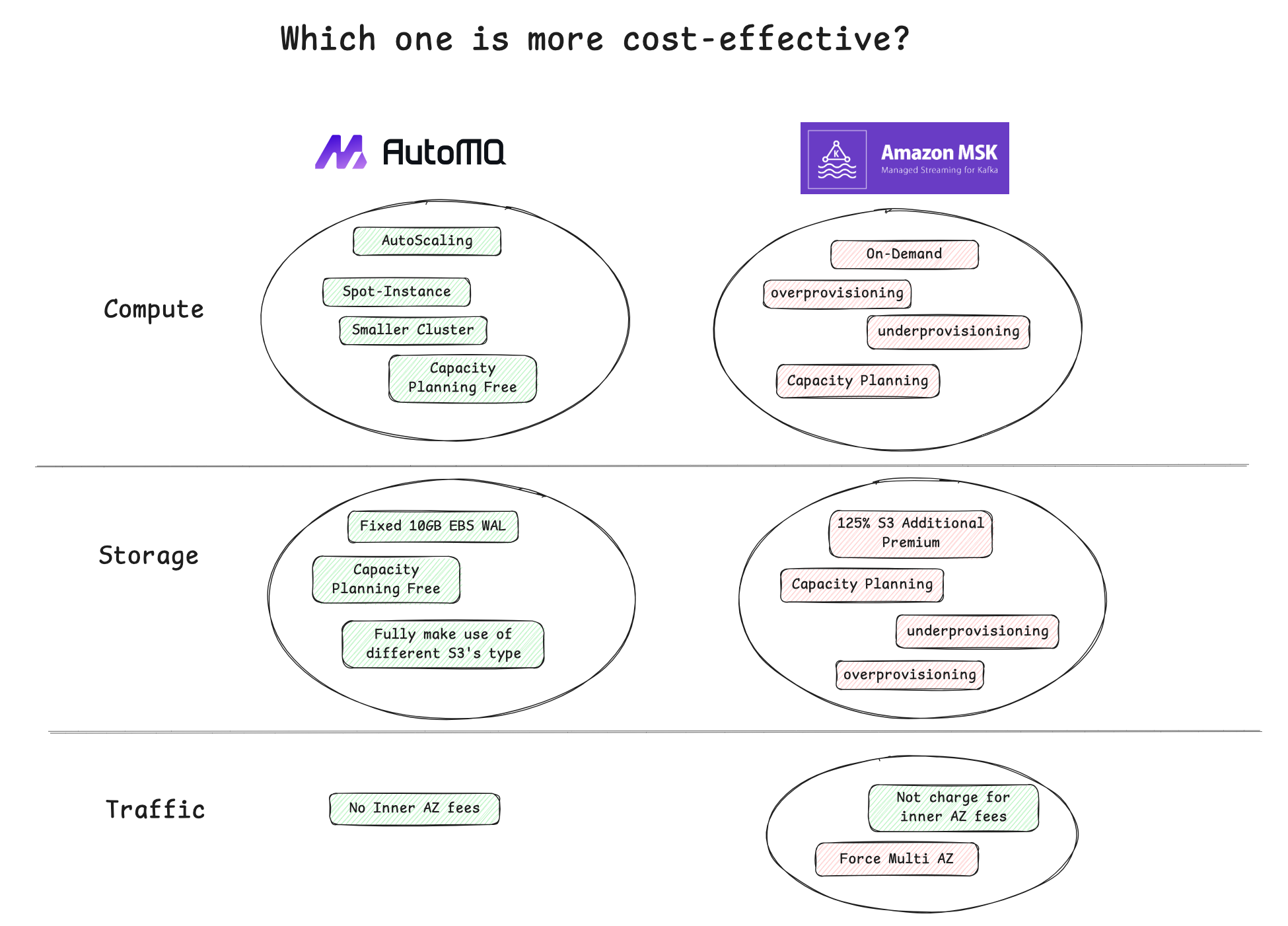 • Scaling Impacts on Business Read/Write Operations, Unable to Meet Future Business Changes : Business operations are continually evolving. Even with pre-allocated capacity, it's inevitable that cluster capacity will need to be adjusted in the future. Among the customers of AutoMQ services, there are real cases from new energy vehicle companies and e-commerce firms. These companies typically experience marketing events, such as new model releases or discount promotions, during which the Kafka clusters need to handle significantly higher traffic than usual. This necessitates scaling the Kafka clusters up during the events and scaling them down once the events are over. This process poses a high-risk and potentially disruptive operation for businesses. For AWS MSK, the scaling period involves substantial data replication between brokers. This process can take hours to days, and more critically, the read and write operations of the moving partitions can be affected during the reassignment. Each time scaling is required, the development personnel responsible for AWS MSK operations are not only anxious about capacity adjustments but also need to inform and coordinate with business teams, bearing the potential production and consumption disruptions caused by the reassignment. Furthermore, if a failure occurs due to scaling, AWS MSK users typically have no recourse to mitigate the impact. The author once performed a scale-down operation on an AWS MSK cluster and had to wait over three hours, during which the operation could not be interrupted and had to be completed in its entirety.