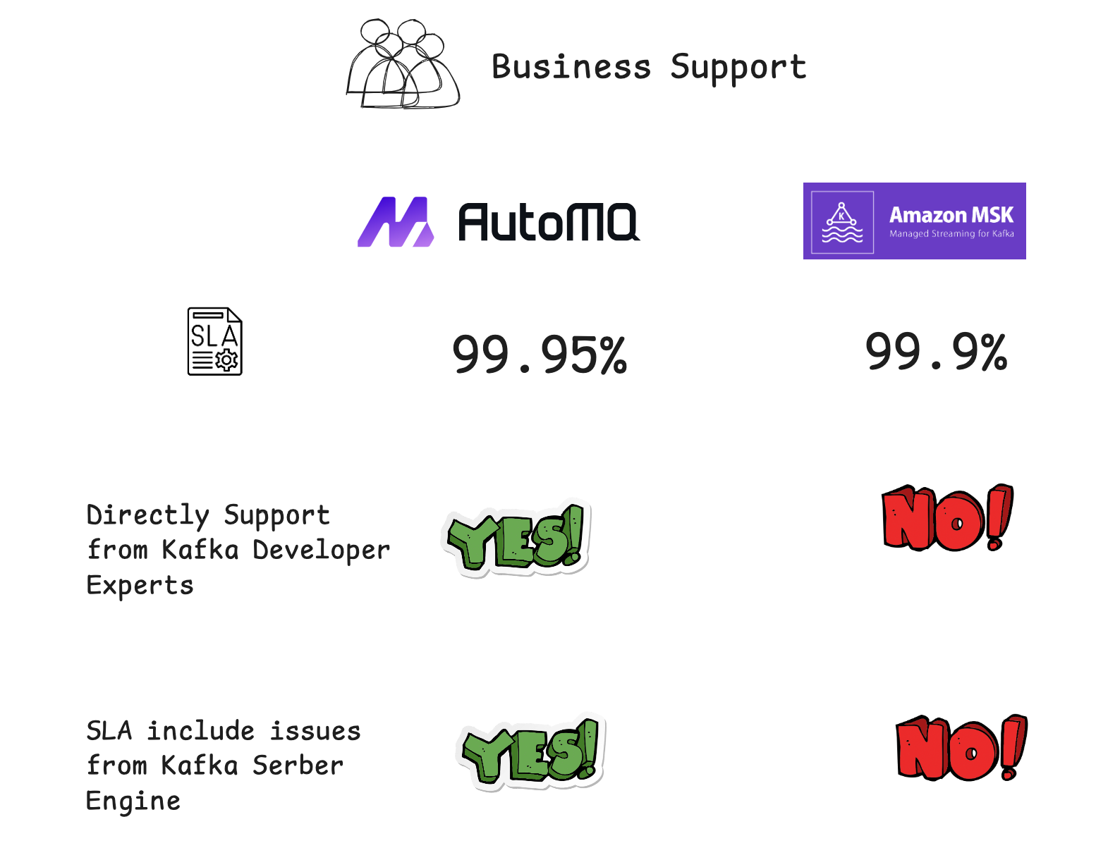 In terms of service support and assurance, AutoMQ offers the following two notable differences compared to AWS MSK, aside from having a slightly higher SLA:
