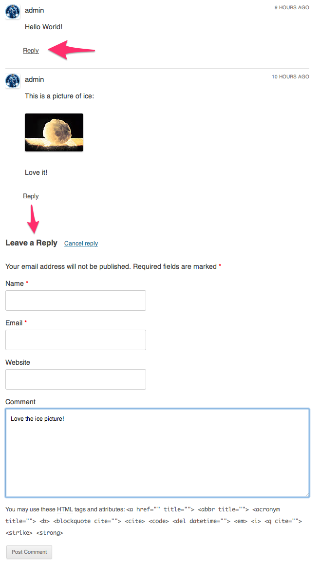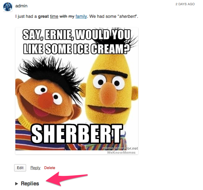 @mjangda reply comments are now rendered in the template. Screenshots are from Chrome which supports the |