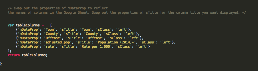 - Change the properties of 'mDataProp' to match the exact names of the columns in Google Sheets. Then, change the properties of 'sTitle' to change the name of the column that will show up in the database.