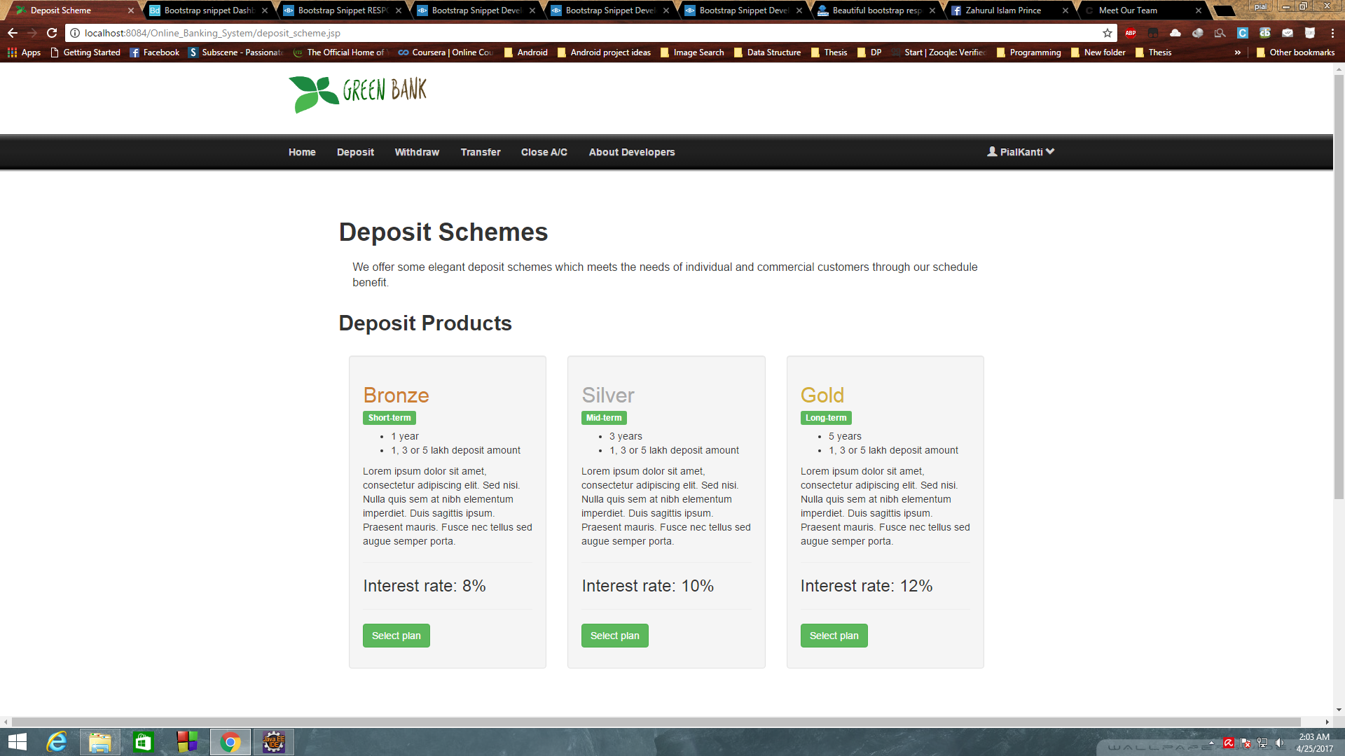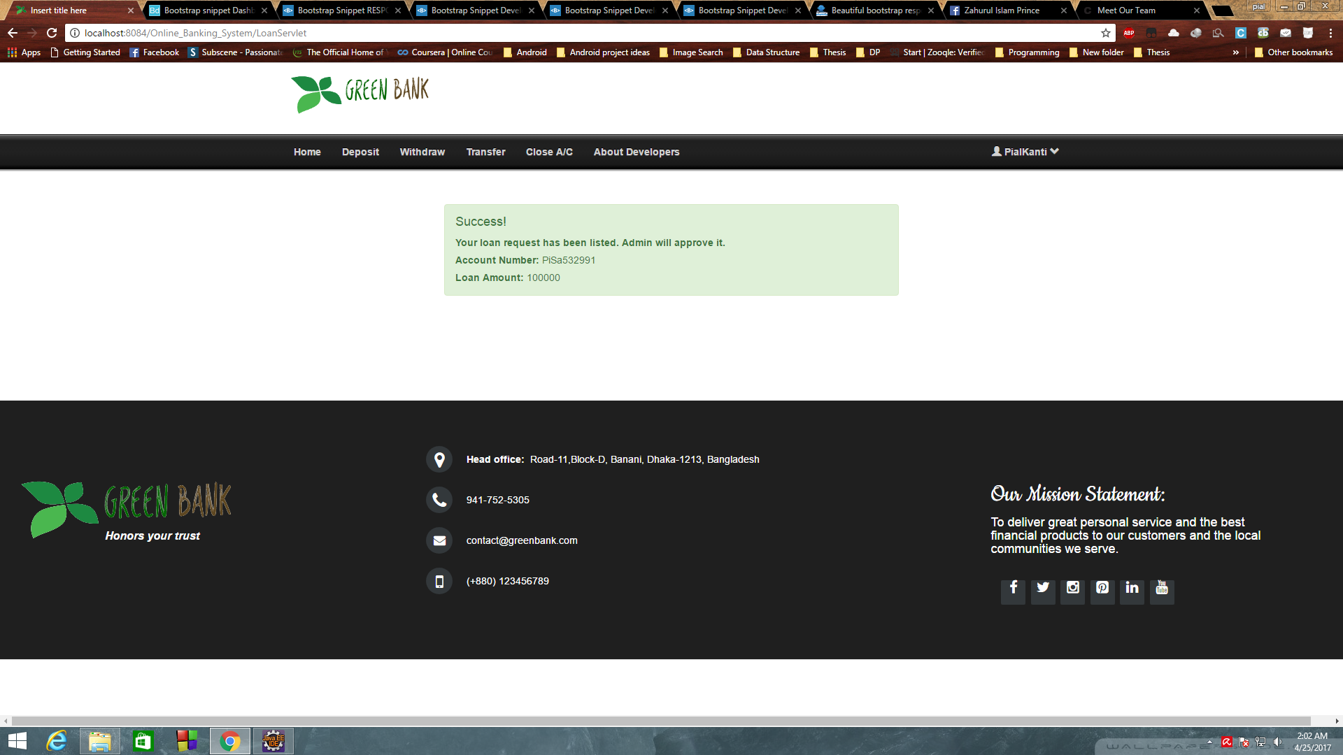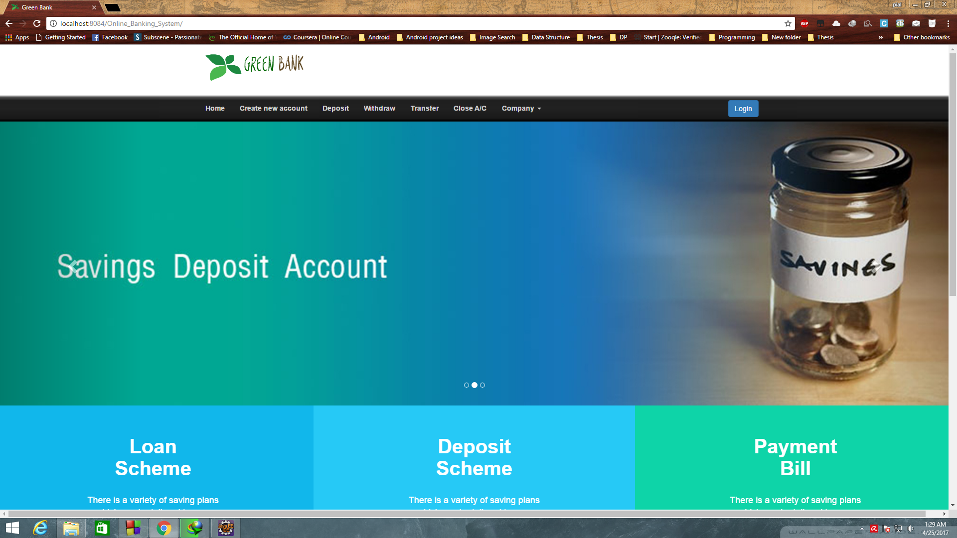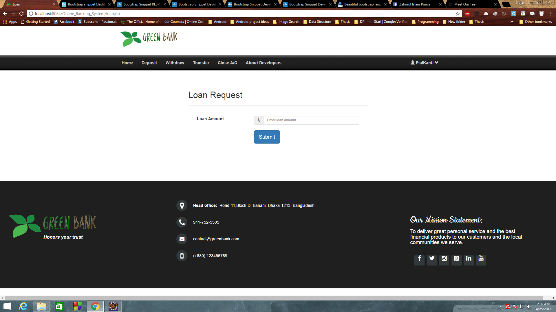 Online-Banking-System Java, J2EE based website for online banking system Demos Home Page Footer Registration Form Login Wrong username/password Withdraw form Transfer Form Load Request Load Request Success Deposit Schemes Silver deposit Scheme Meet Our Team