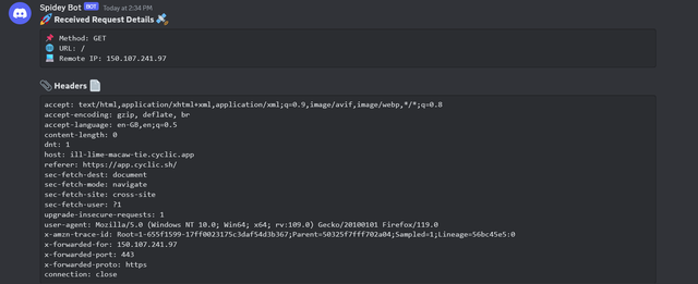 Once the server is up and running, it'll capture incoming HTTP requests and relay their details to your Discord channel. Access the server via the URL provided by Cyclic.sh and observe the forwarded request details in Discord.