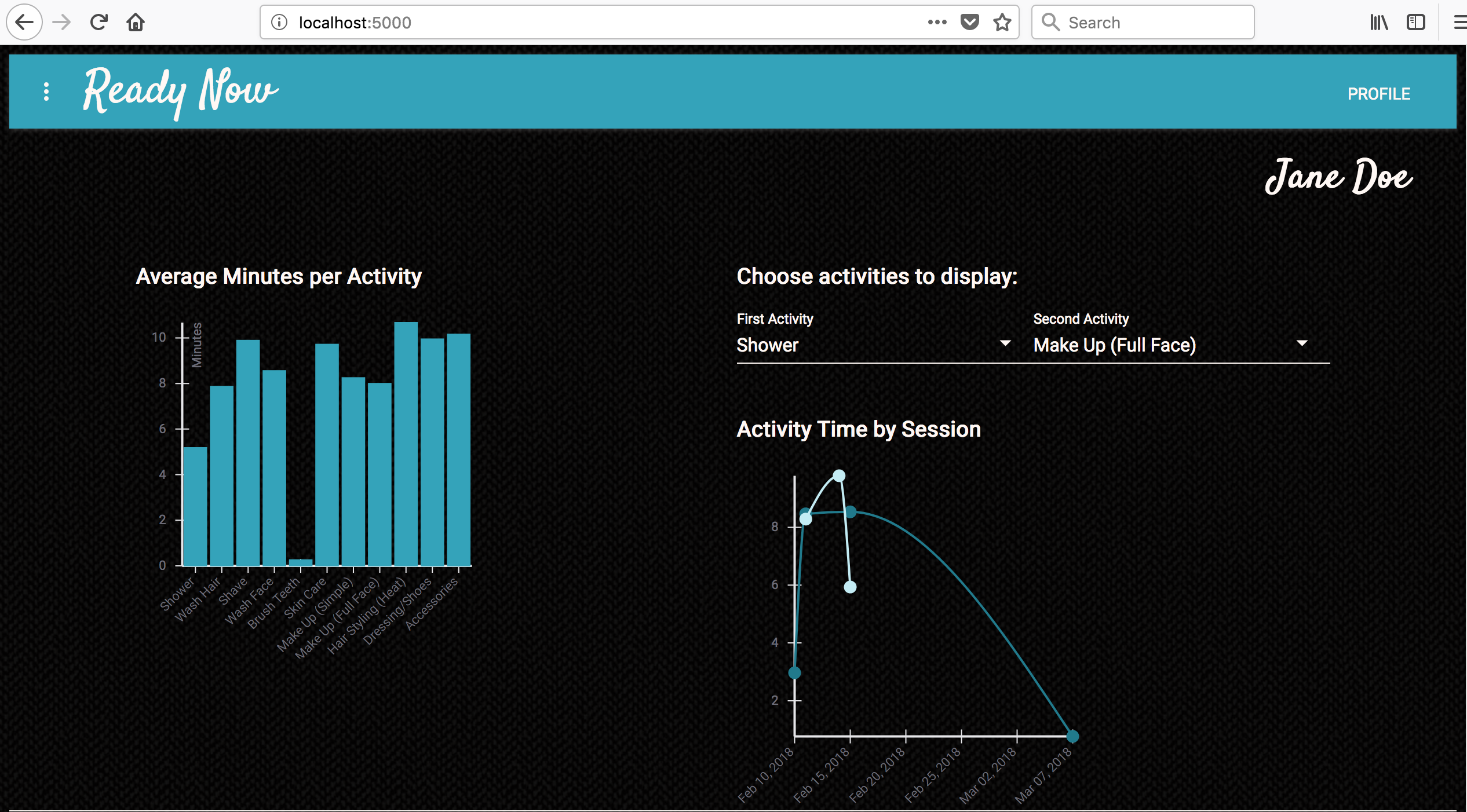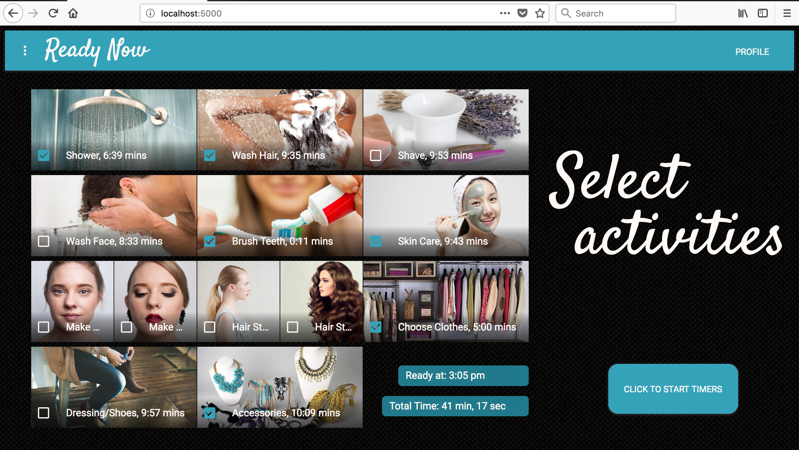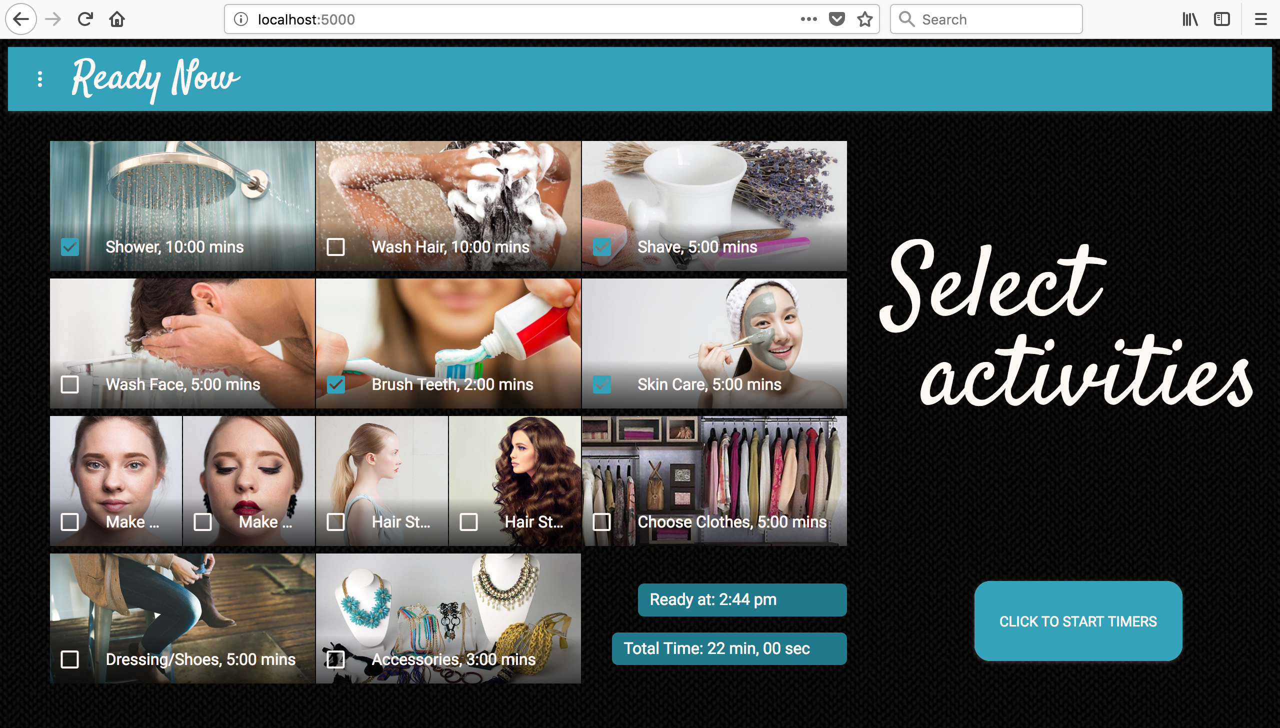 This single page time management app in React has a backend in Flask and PostgreSQL. Ready Now gets smarter with each use by capturing timestamps with JavaScript timers, sending the data to the server via AJAX fetch requests, and adds new records to the database with SQLAlchemy. That information is aggregated and queried to provide personalized timer estimates for the user.