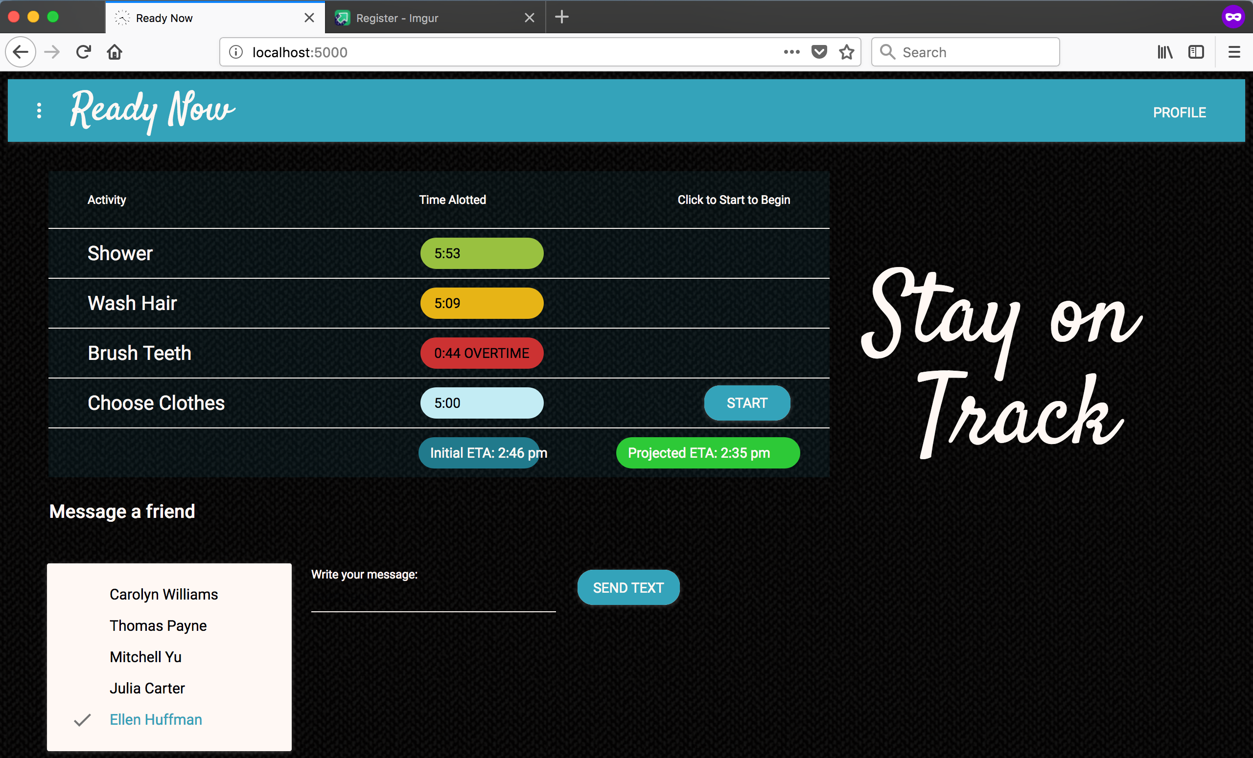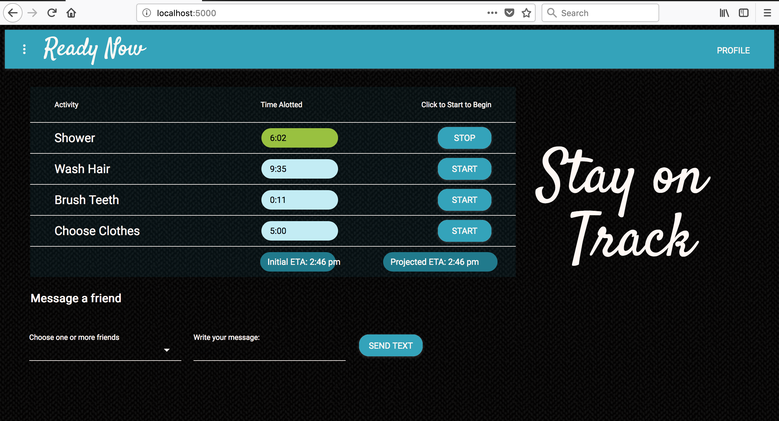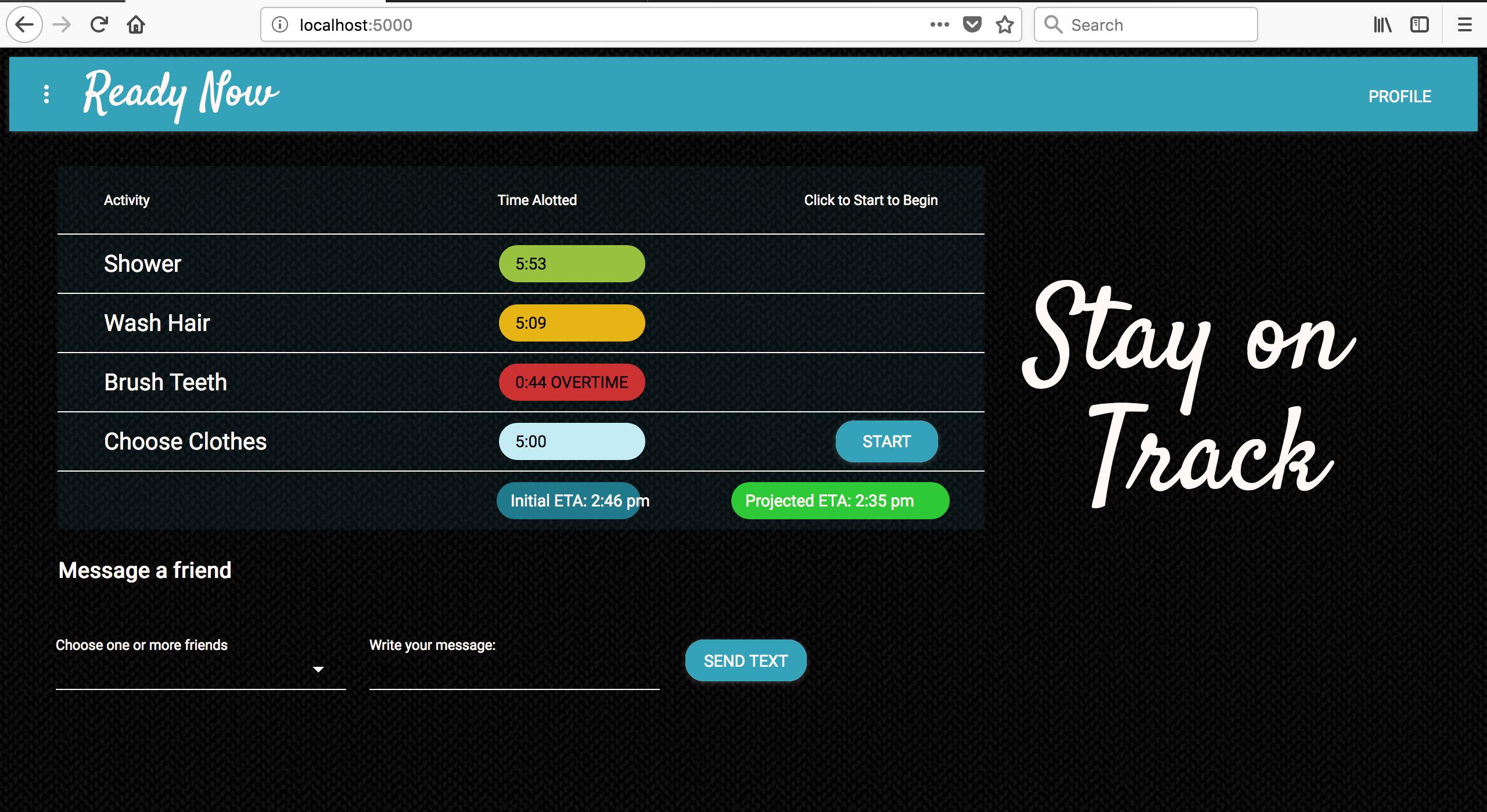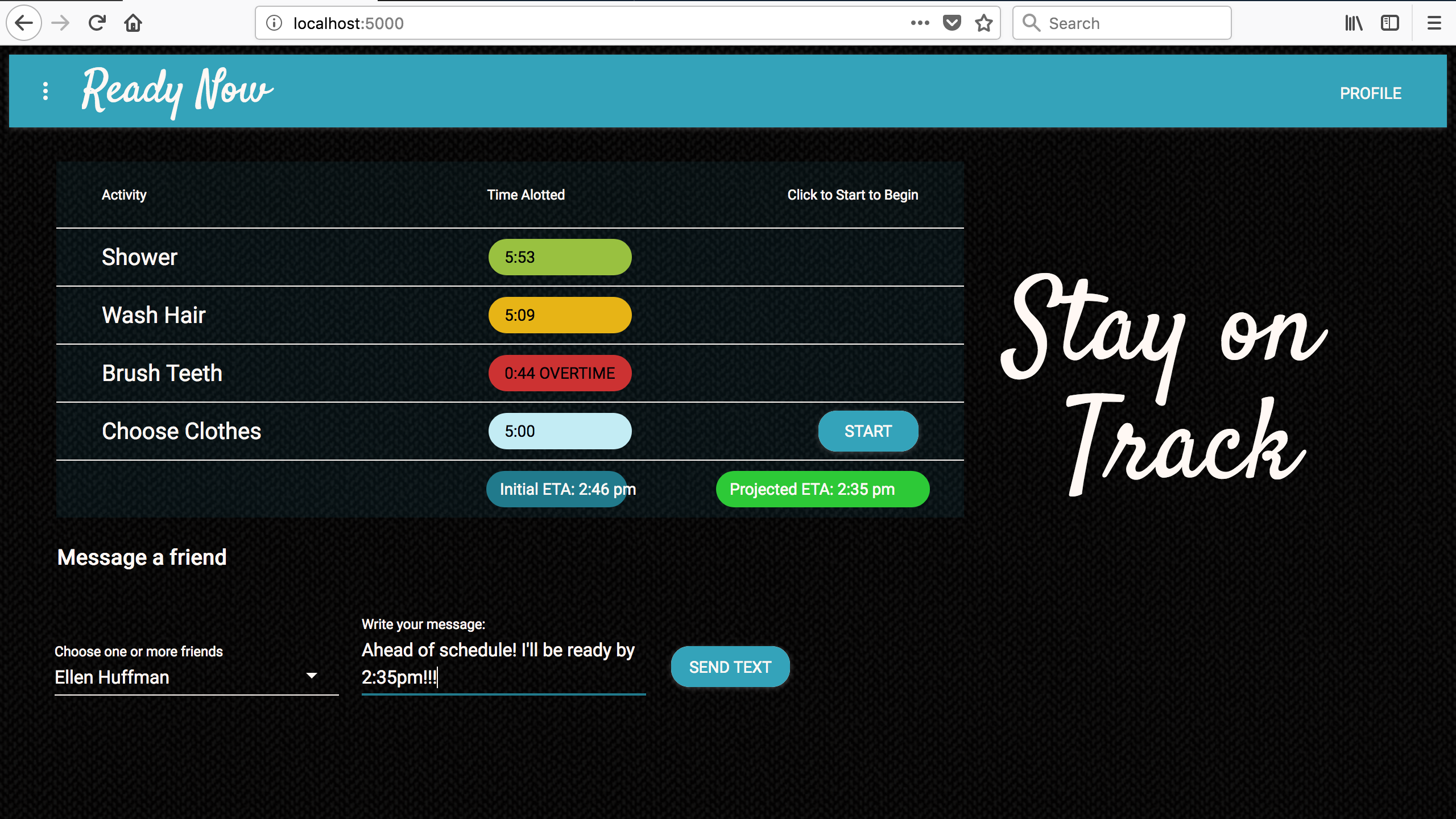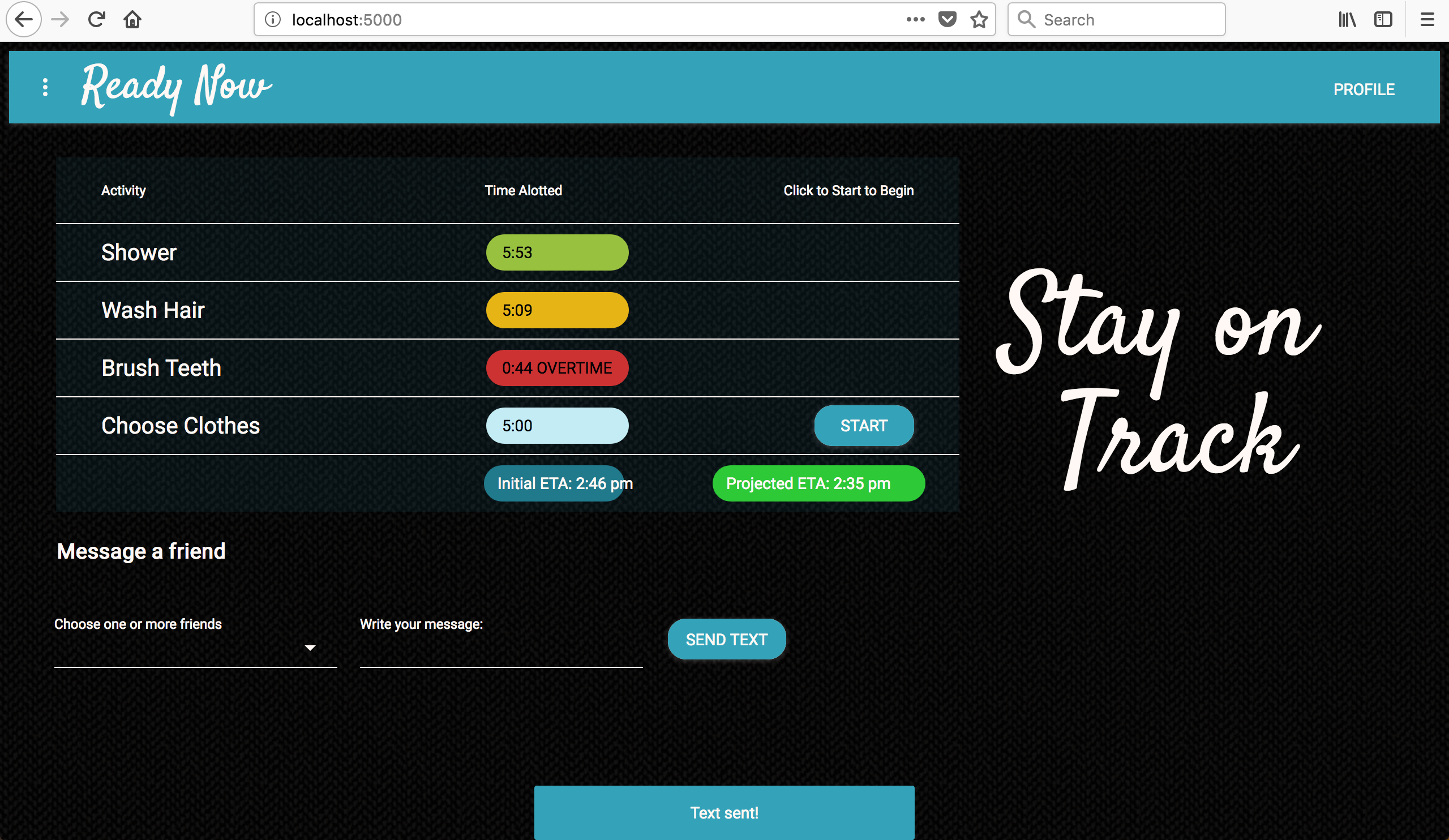 As the user goes through each step, the projected ETA is recalculated and changes color to reflect any changes to the time. All calculations and color changes are done with conditional logic in JavaScript. Integration of the Twilio API allows the user to directly text a friend as they're using the timers.