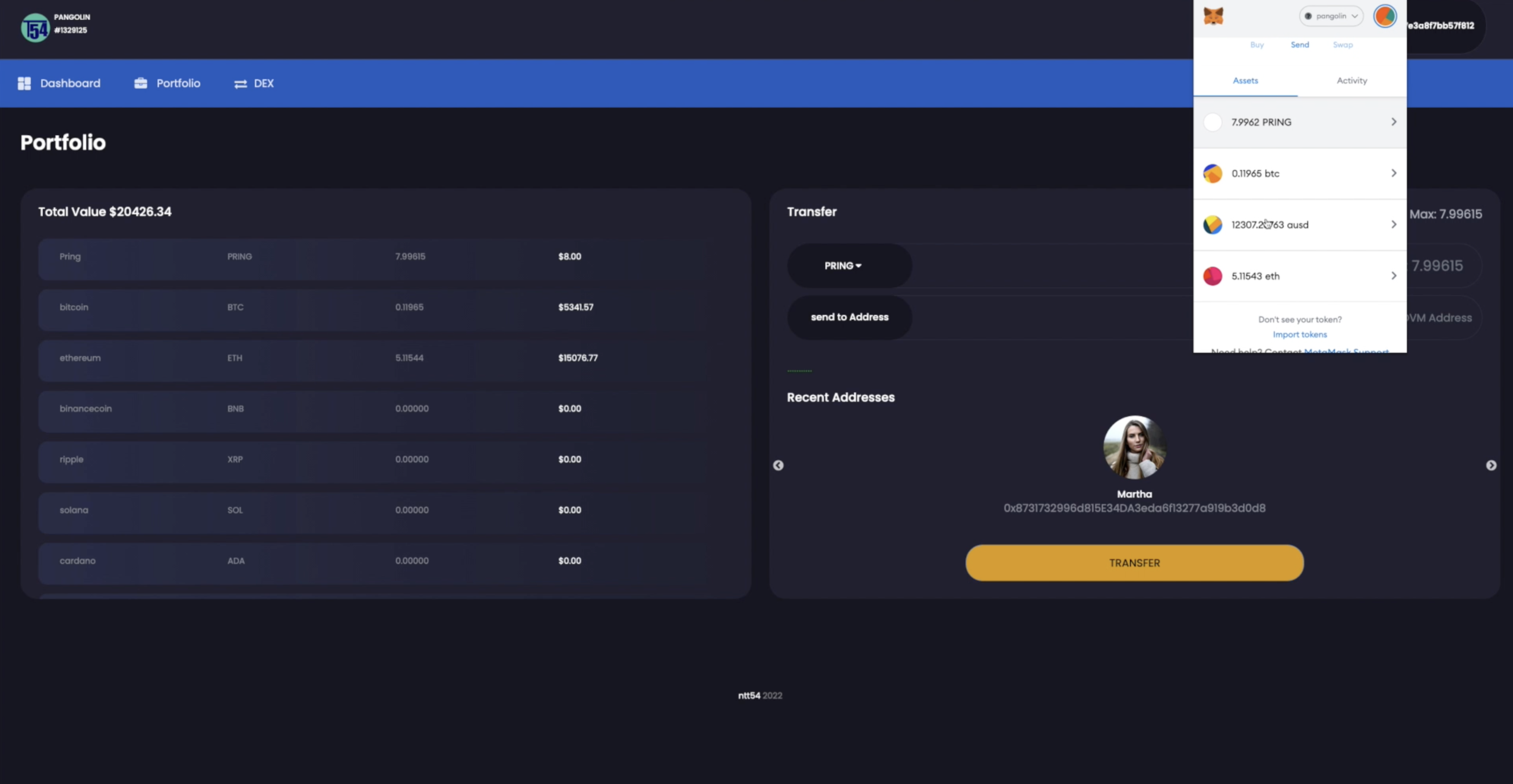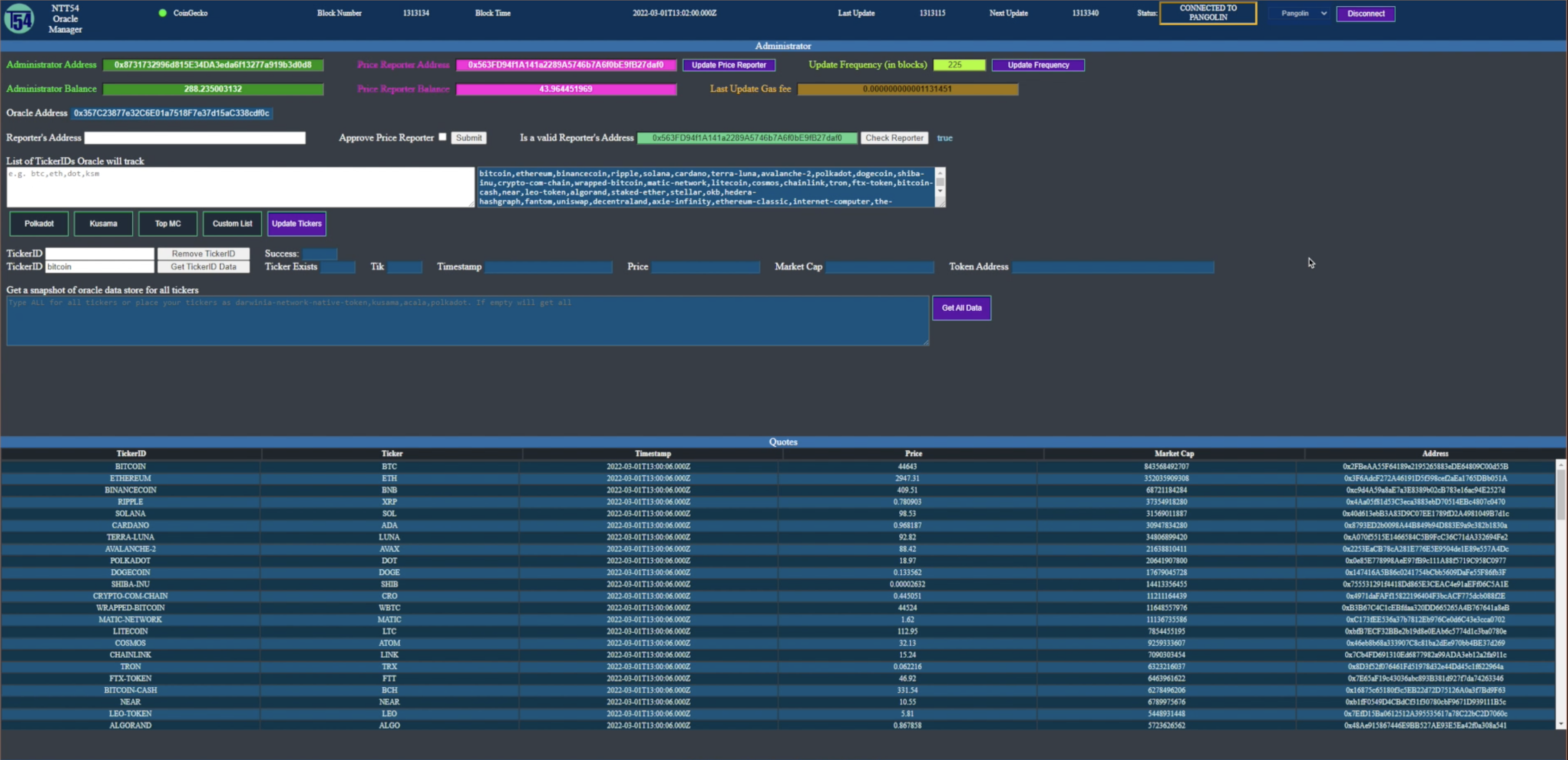 Backend contains two parts Oracle and Minter We have deployed an Oracle smart contract We are running a webserver. Anyone can run a similar webserver by typing $node server.js here https://github.com/Entity54/DarwiniaHackathon/tree/main/Pangolin_ntt54_Oracle_backend/ntt54_Oracle_webserver/server The webserver at initialization offers a basic front end and it reads basic information about available token data offered by coingecko api Webserver front end allows to approve another account address as price reporter so it can update prices in the oracle smart contract Automatically we have approved this address 0x563FD94f1A141a2289A5746b7A6f0bE9fB27daf0 as price reporter. The admin chooses the list of tokens from coingecko that wants the smart contract to store prices There are some predetermined lists and in our example we use the custom list The custom list contains 114 tokens (the top 100 tokens by market cap as seen on coingecko page, excluding stable coins and adding most polkadot and kusama coins available at time of deployment) It needs to be emphasized that the admin can add further tokens or remove existing onesThe second part of our backend and scrolling down from the Oracle (on the webpage as shown on the video) we can see that the admin can click and mint any tokens being tracked by the oracle smart contract that have a default 0 address, Tokens are now minted to ERC20 tokens with a total supply equal to the circulating supply as published at coingecko website (if there is no reported cicrculating supply, we use the total supply and if this is not reported either we mint a large number of tokens) The admin of Minter can approve any account address to withdraw any and all liquidity. The admin of Minter is also the admin of all ERC20 tokens minted so the admin can mint , burn ERC20 tokens and also change admin of an ERC20 to another address
