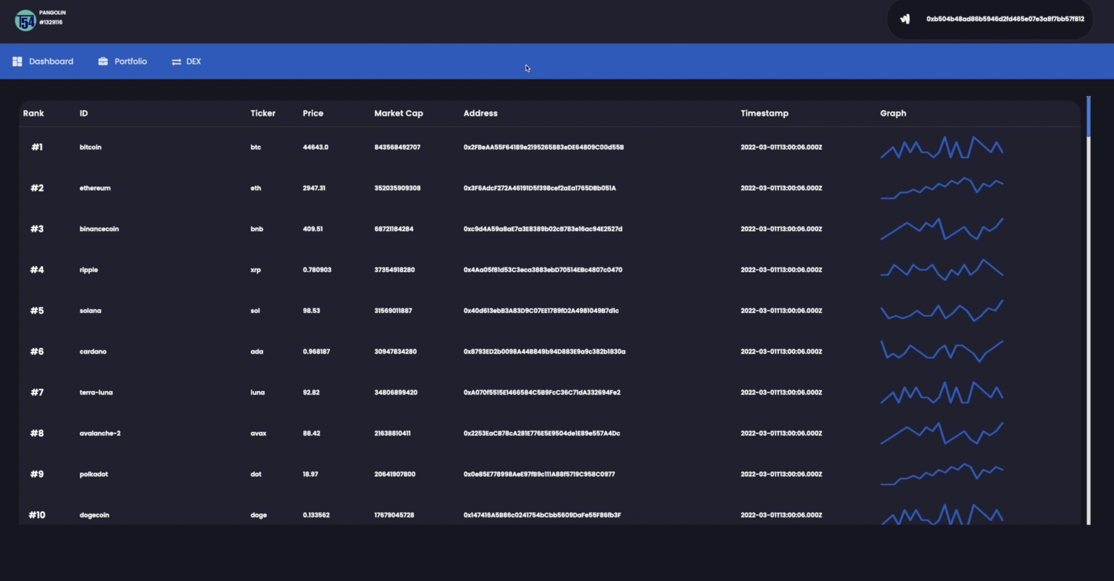 The holdings and usd value for each of the 114 tokens we have minted, and the total portoflio value of the account chosen. This updates once every 20 blocks