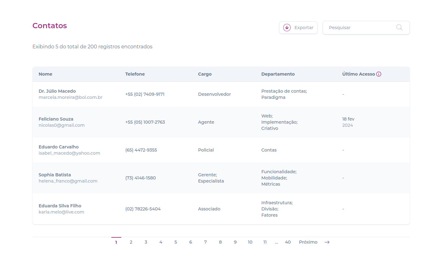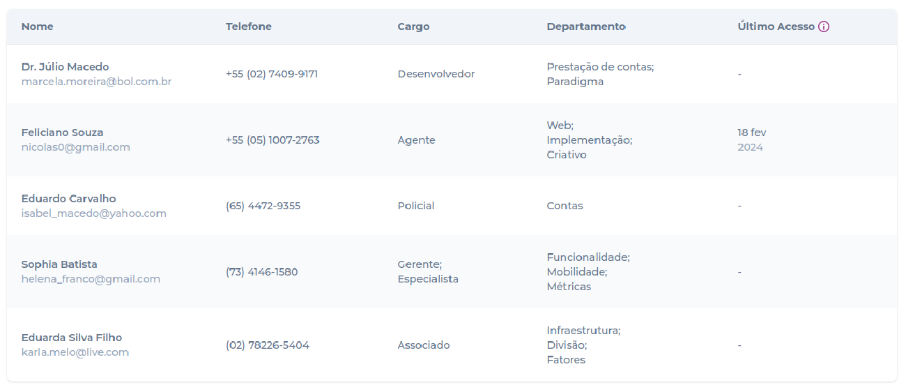 Nome (com email abaixo) | Telefone | Cargo | Departamento | Último acesso