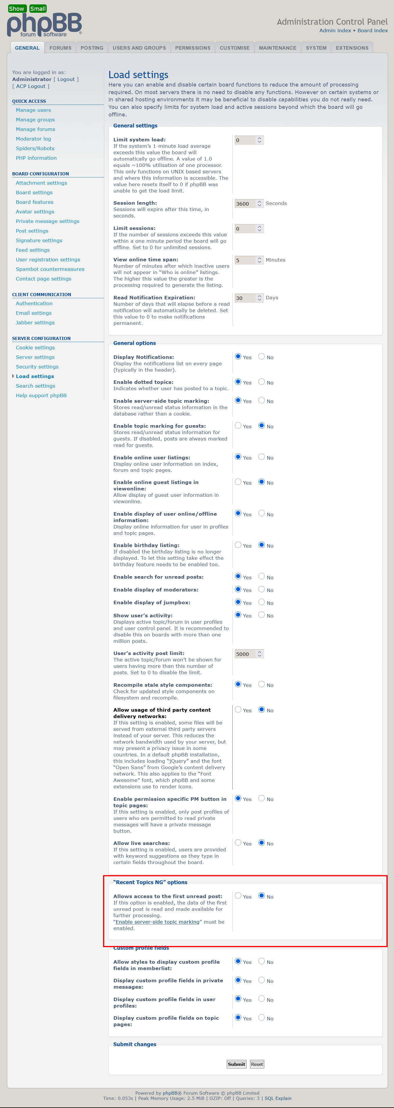 Extension for phpBB - Adds a list with a number of recent topics to the board index. They can be displayed at the top, bottom or side of the page. You can also display the recent topics on a separate page. The first, last or last unread posts can be displayed in the topic list. The settings in the UCP and the user administration are displayed depending on the user permission.
