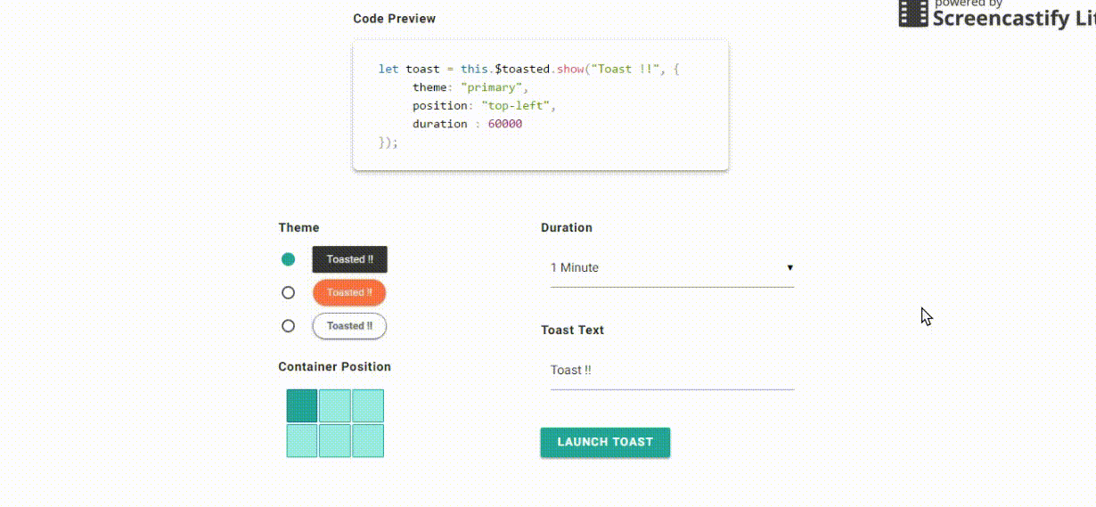 vue-toasted is a cool material toast plugin with variety of options and styles. it is touch compatible and responsive. issues and pr's are always welcome