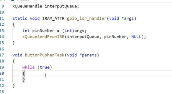 When I copy code from the inmterrupt video for gpio pin, I get a warning xQueueSendFromISR. Warning: Incompatible integer to pointer conversion passing 'int' to parameter of type cost void. xQueueHandle intQue; static void IRAM_ATTR wake_int(void * args) gpio_set_intr_type(POWER_EN, GPIO_INTR_NEGEDGE); |