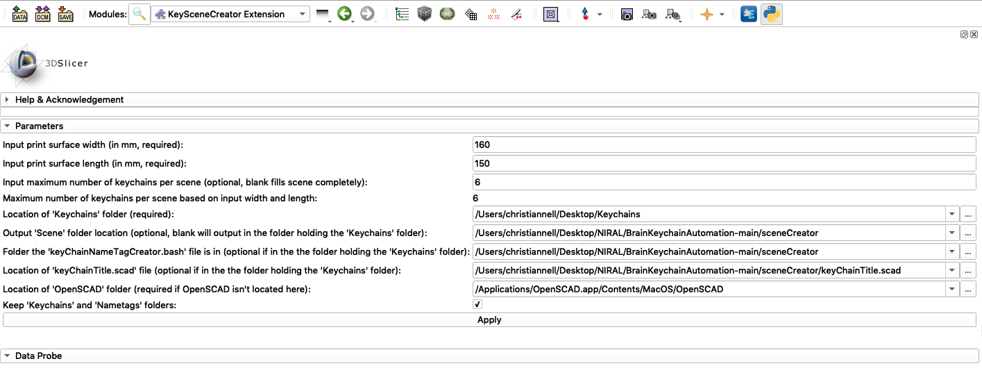 - Click 'Apply' and let the module run. If it says that 3D Slicer is not responding or has a loading icon, do not worry. The module takes roughly 3-5 minutes to render each keychain. Slicer will be unresponsive during that time.