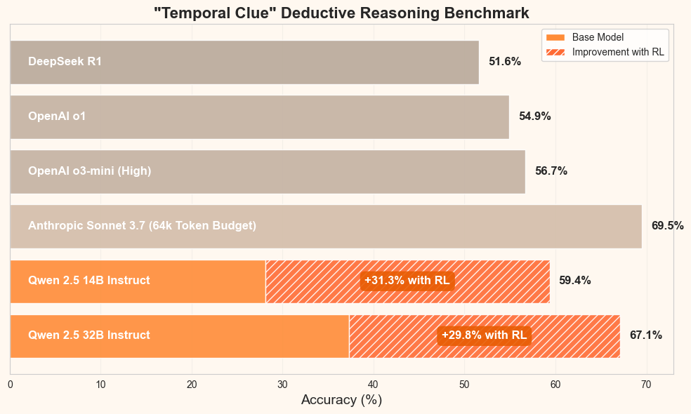 We used the Temporal Clue puzzle dataset to train Qwen 14B and 32B models, improving their deductive reasoning capabilities significantly through Group Relative Policy Optimization (GRPO). Our trained models approach the performance of leading proprietary models like Claude 3.7 Sonnet while maintaining cost efficiency.