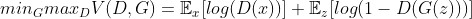 GAN refers to Generative Adversarial Networks, which has two sets of networks: the generator and the discriminator. The idea is that the generator tries to generate result that seems to be from real domain while the discriminator recieves both the generator-generated result and real data and gives a probability that the given input is from the real domain. The goal probability for discriminator is 0.5: the discriminator cannot tell the input is real or fake. To understand this better, let's take a look at GAN's loss function: