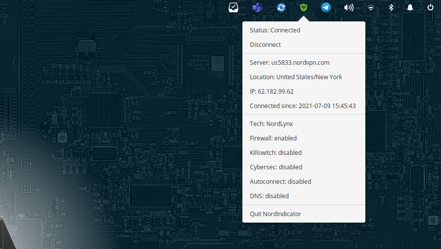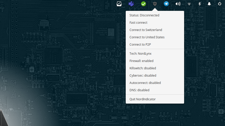 NordIndicator is a Python script that lets you connect, disconnect and check your NordVPN connection status and settings from a simple GNU/Linux tray app indicator. It integrates with your system so it autostarts with it, and you can also launch it from your OS app menu.