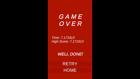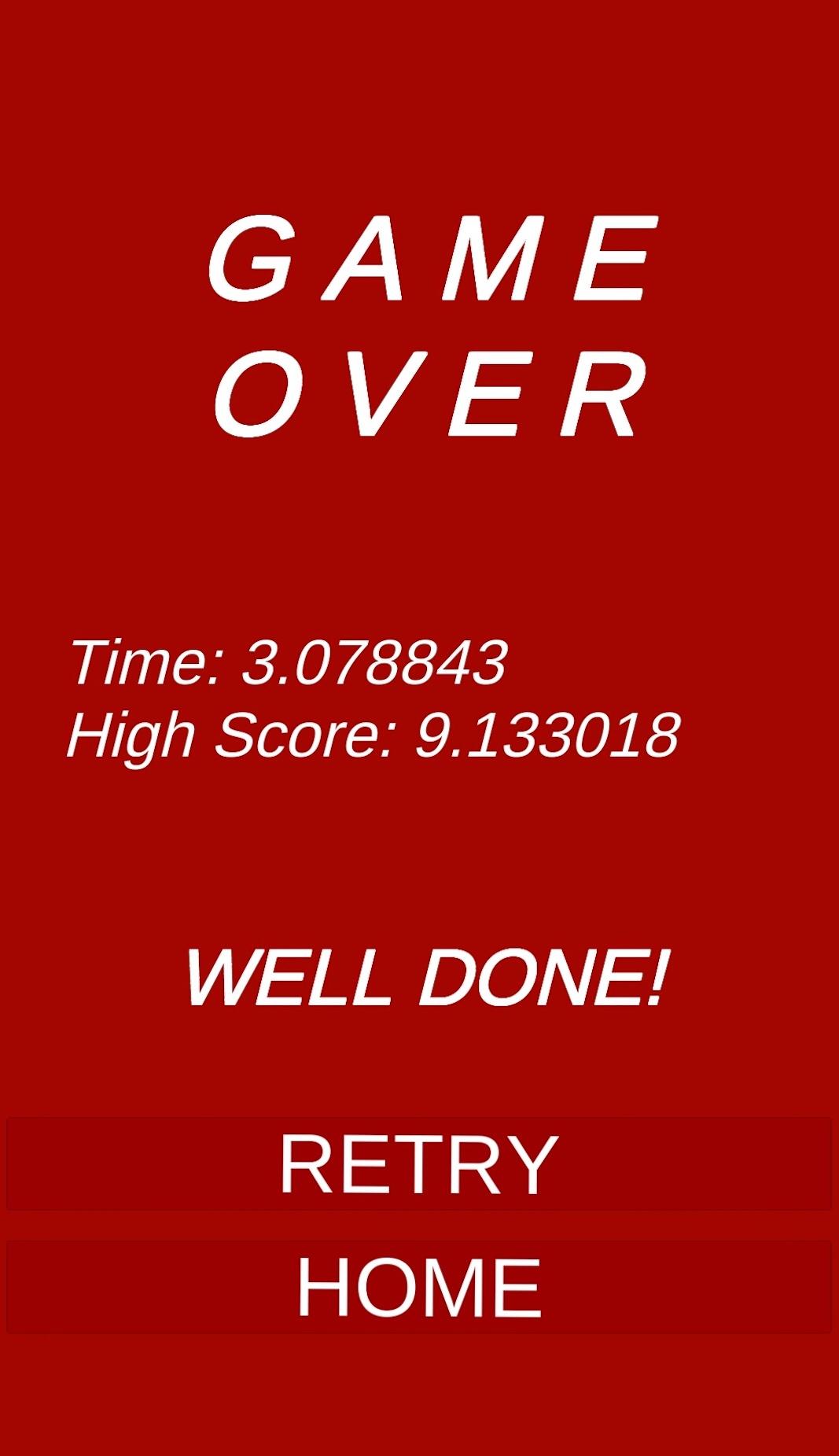 the user is sent back to the home page.This page lets the user see their score (time lasted), as well as the highest score achieved by the user (pertains after closing).