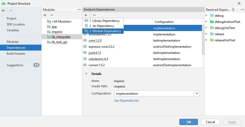 git clone https://github.com/VihangaAW/imperio.gitIn Android Studio, go to File -> New -> Import Module In the "Import Module from Source" pop up, select the path of the downloaded module and click Finish Now you have to build the project, to do that, go to Build -> Make Project