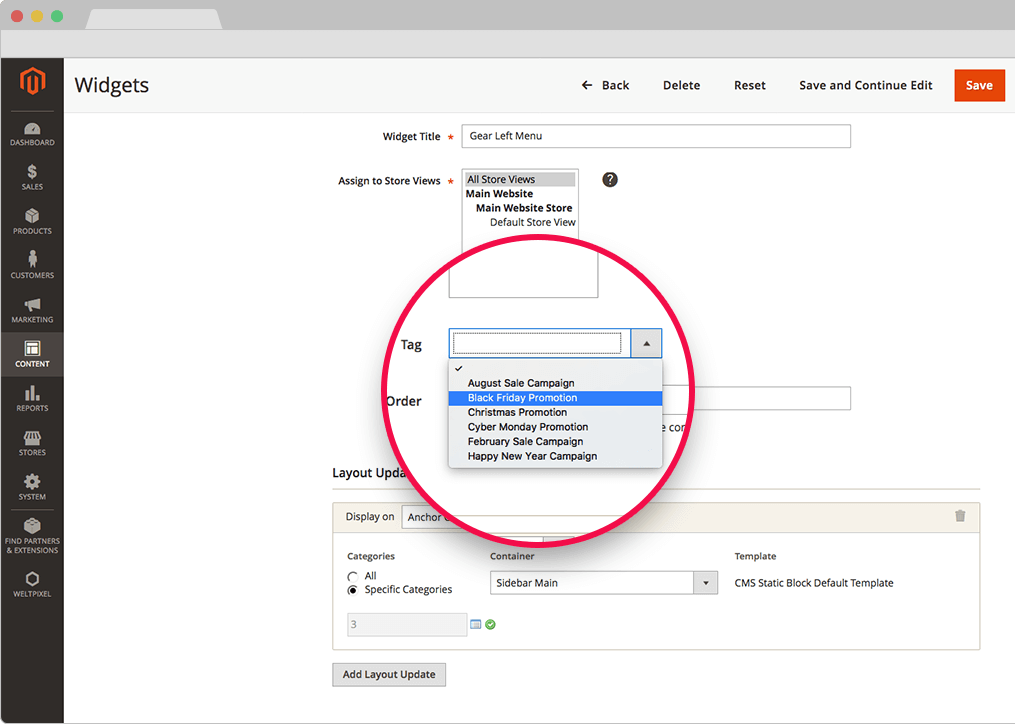 - The list of Tags can be found in Admin ->WeltPixel -> Manage Tags