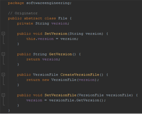 When a user makes a changes in the documents, the user save the file and document management system store all versions of the file. I chose memento design to do this. My file class is originator class. It is used for saving which version (state). I have a VersionFile class and it is my memento class. It maintains the version of the file (originator). VersionTaker class is a CareTaker class and it stores all versions of the memento. So, I can access to any version of the file via VersionTaker.