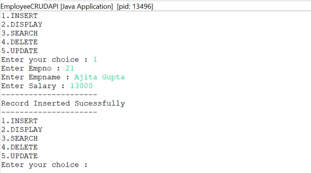 Now let's for a change have a look at a menu-driven Employee CRUD application: EmployeeCRUDAPI.java