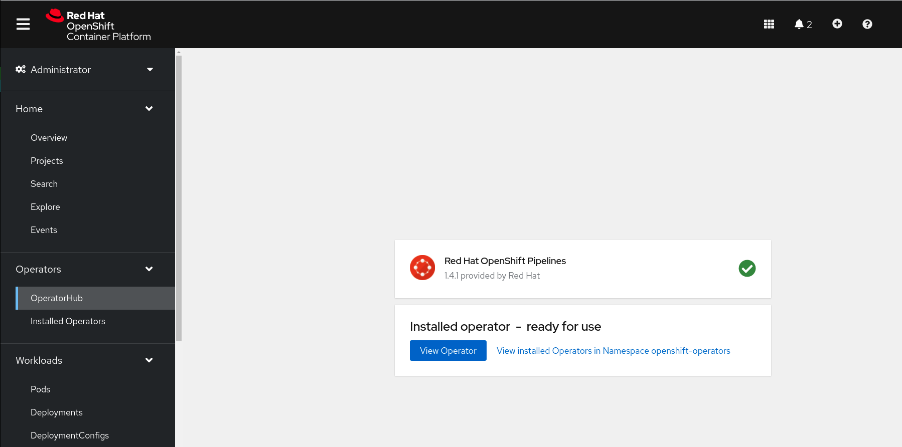 From the left-side menu under Administrator perspective, go to Operators-> OperatorHub. In the search box, search for pipelines, then click to OpenShift Pipelines Operator:
