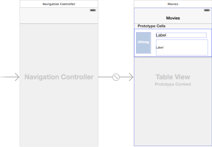 - From the IB library, drag a UIImageView and two UILabel controls inside the Cell. Place the UIImageView on the left hand side, one UILabel to the right side of the image to be used for the movie title, and one UILabel below to be used for the movie synopsis.