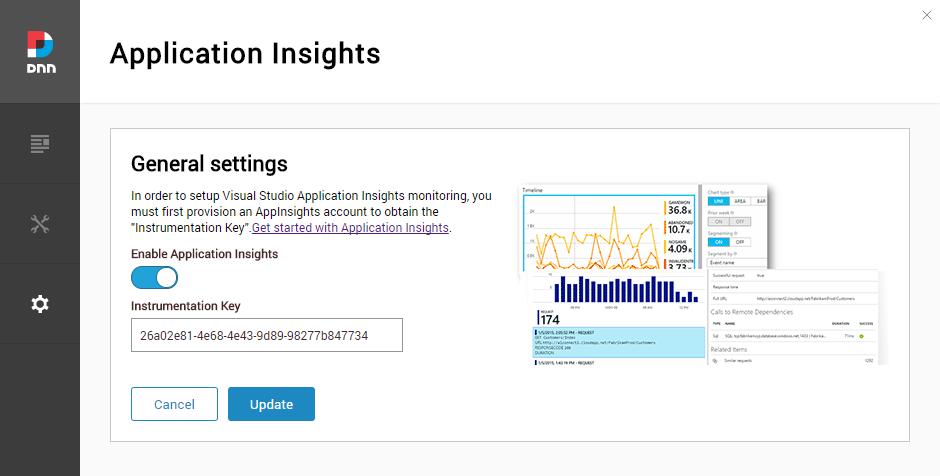 This module is a DNN Platorm extension to integrate Microsoft Application Insights to monitor your DNN installation. To setup the module on your installation, follow these steps: