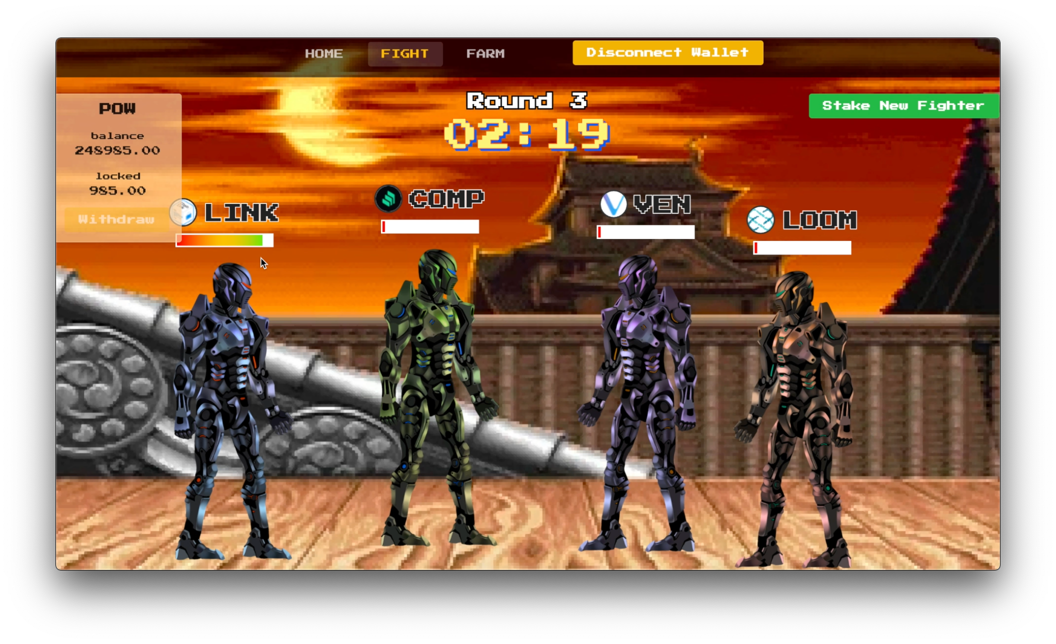 The votes are animated as arcade street fights, with the various ERC20 tokens as the fighters. To vote for a token, all you need is a few POW tokens. Whichever fighter token gets the most POWs backing it, becomes the winner for the week and gets to seed the next farm. A vote (a fight) takes 2 days and afterwards farming the pool takes a week. We're then back to fighting in a new round with a new winner, and so forth.