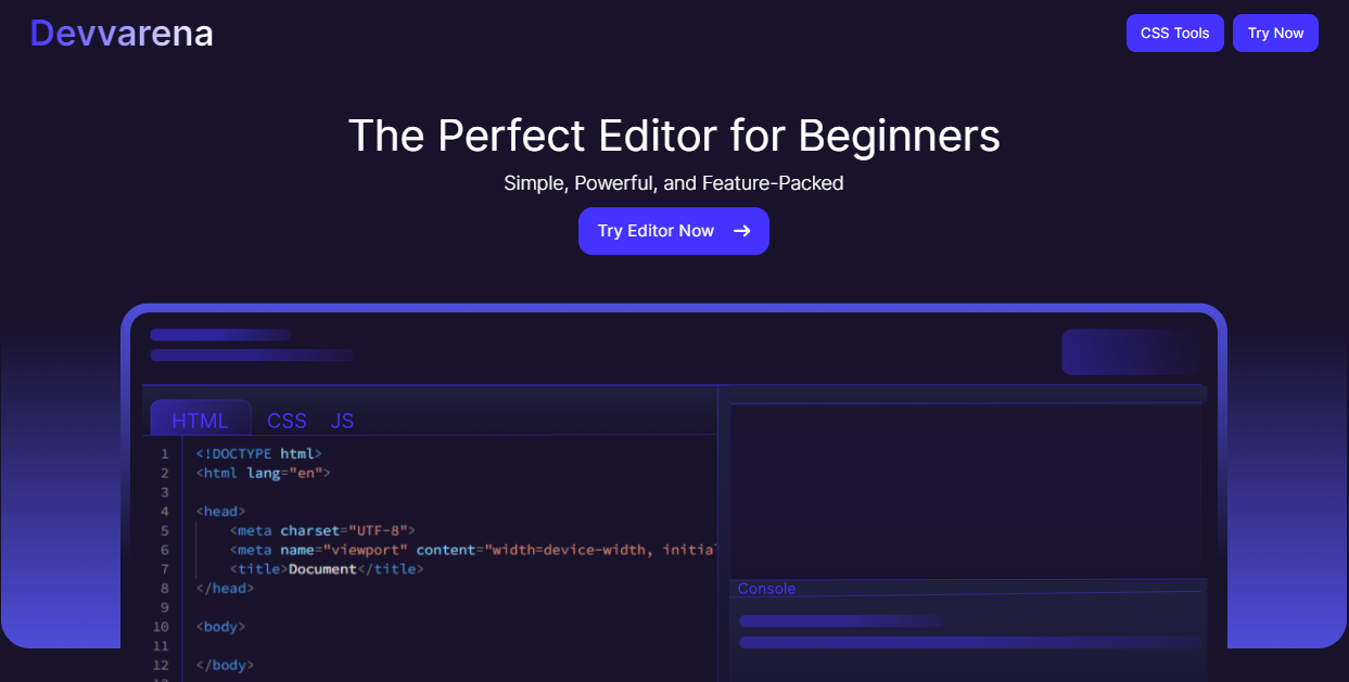 It is a beginner-friendly frontend editor packed with features like CSS tools, a JavaScript editor, an HTML editor, and a CSS editor, along with a JavaScript console for debugging.