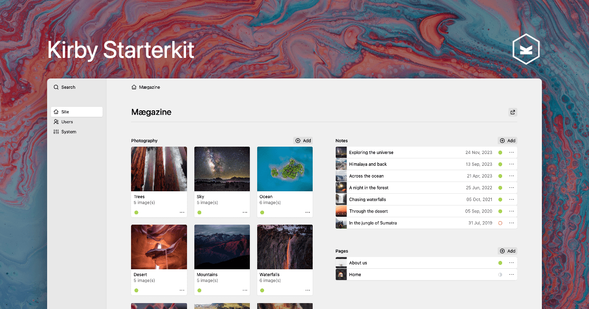 Kirby: the CMS that adapts to any project, loved by developers and editors alike. The Starterkit is a full-blown Kirby installation with a lot of example content, blueprints, templates and more. It is ideal for new users to explore many of Kirby's options and get to know the Panel.