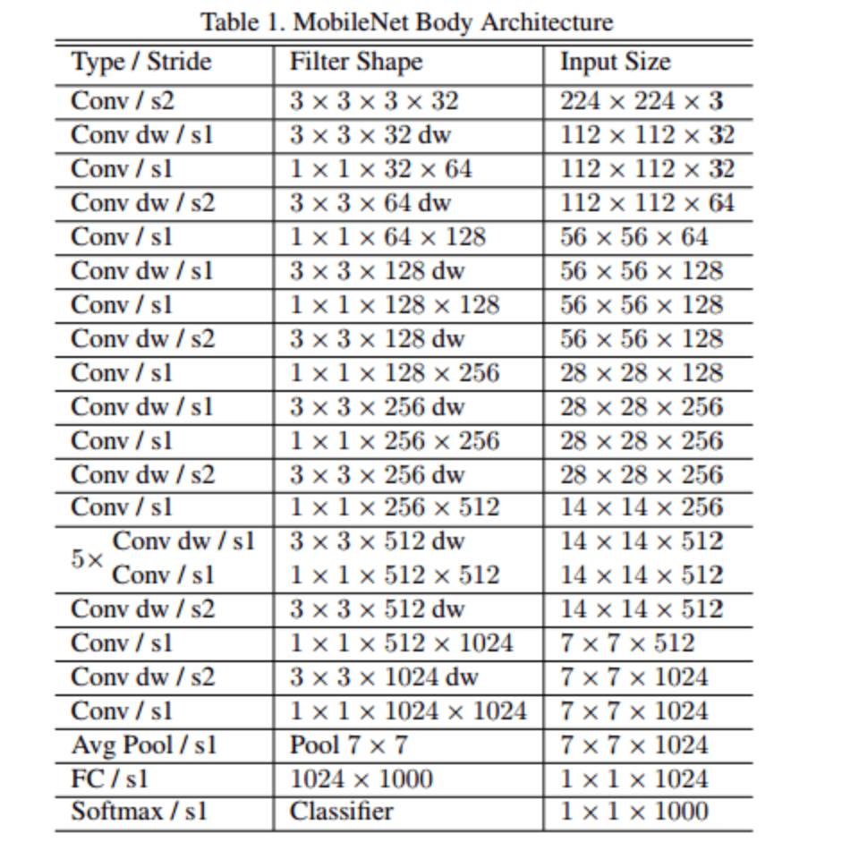 MobileNet 网络结构里面第一层是标准的 3 * 3 卷积核,接下来是 13 个上图中的深度可分离卷积,最后通过 MEAN 平均池化来操作,输出 1 * 1024。