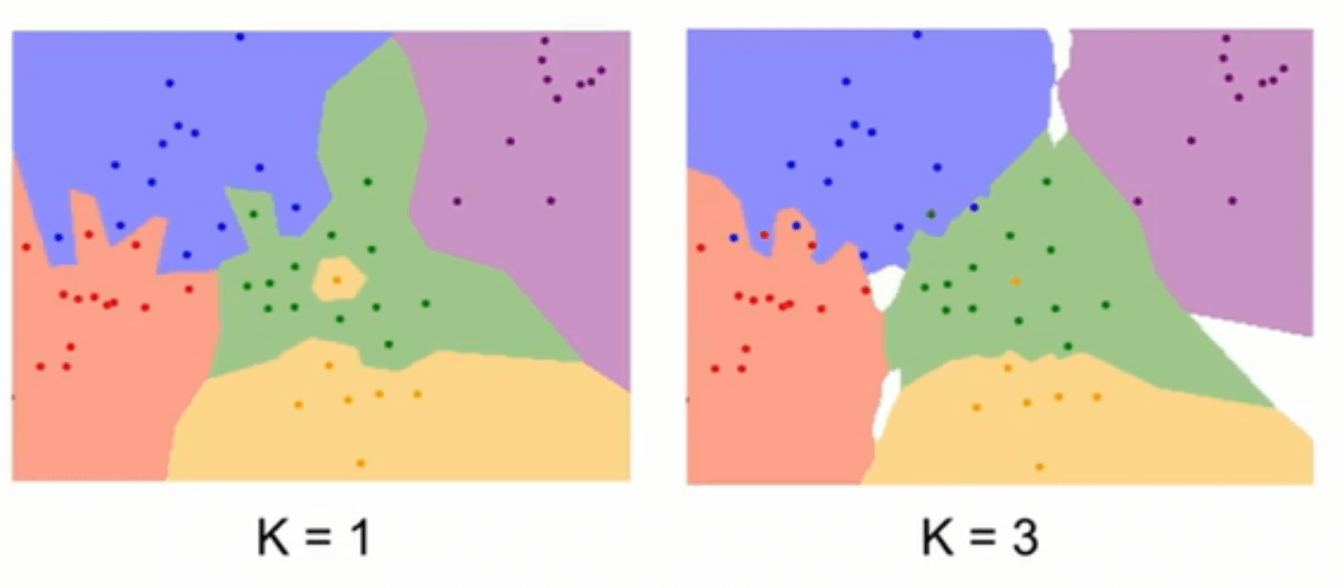 图像的突出的点,代表训练集的分类,其他像素点的颜色代表其归属的分类。当是 k = 1 也就是普通的 Nearest Neighbor 分类时。可以看到正中间存在一个黄色点,所有其周围都是黄色区域,但是很明显这是异常的,除了该黄色点,周围突出点都是绿色的,分类器将该黄色点周围区域分类为黄色是错误的。可以看到当 k = 3 的时候,中间区域都是绿色的。那是不是 k 值越大越好呢?通过大量测试可以发现 k 在 7 的时候可以达到比较好的效果,当然成功率也不过 32%。