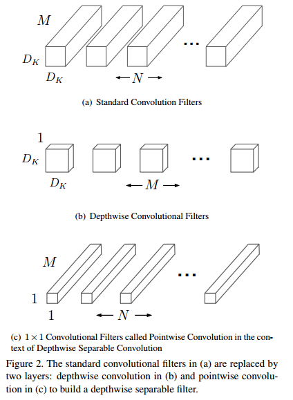 图 a 是标准卷积核 DK * DK * M * N,其中 M 为输入通道,图 b 是深度卷积核, M 个 DK * DK,图 c N 个是 1 * 1 * M 卷积核。
