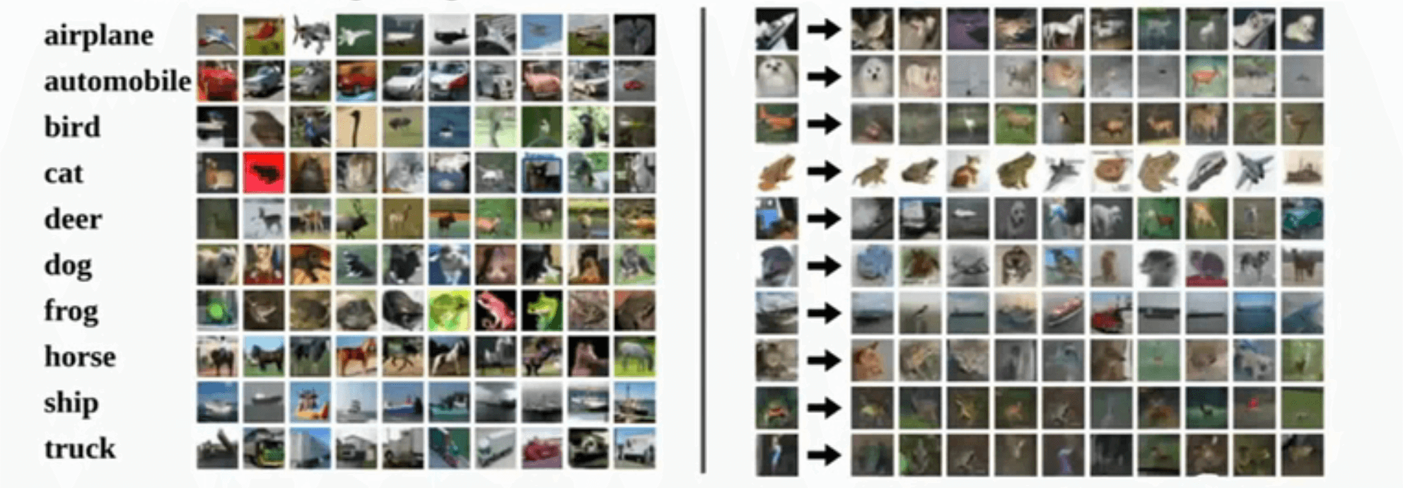 上面的例子使用 32 * 32 的图像,左边是训练集,右边第一列是输入,而第一列后面是算法找到的最接近第一列的 10 个图像。虽然有点模糊,但是还是可以看到,命中率不是 100% 的,比如青蛙里面甚至出现了战机,这是因为飞机的背景是白色的,和输入的青蛙高度相似,最后导致误判。这里面是如何比较输入图像和哪个形似的呢?
